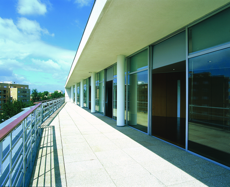 The perimeter of the terrain led to the concentric movement of the west facade, punctuated by an aluminium "Brise-soleil".