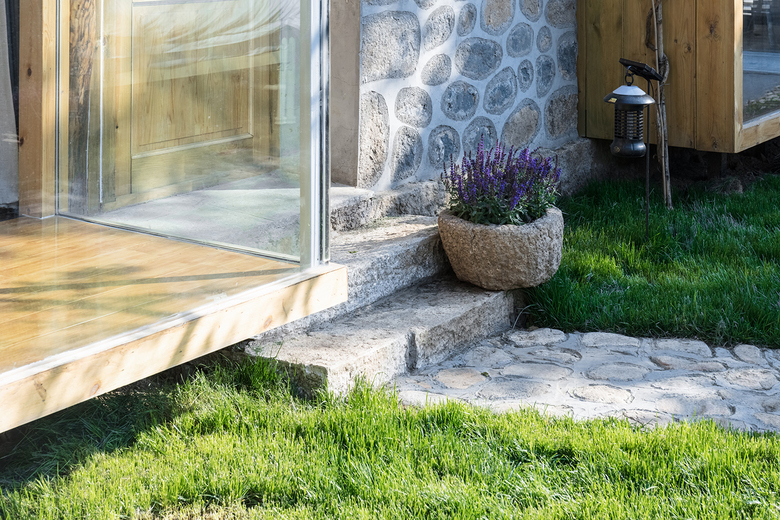 During the reconstruction of the old house, the original timber structure has been reserved, while part of external walls has been renewed. We reserved the whole stone walls, but rebuilt the southern wall. Meanwhile, we redesigned the entrance and windows, as well as the viewing boxes. We tore down the shabby roof, added insulation and waterproof layer, as well as the skylight. In addition, the traditional grey roofing tiles have been recycled. What is more, we utilized large area glass to allow nature permeate into the room. The different viewing boxes have been added in each guest room to extent indoor space and promote the communication between architecture and nature.