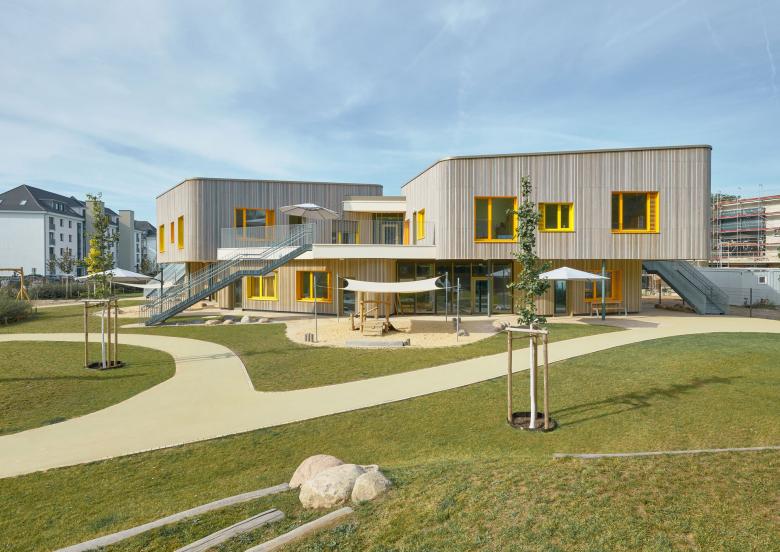 The way in which the individual groups are organized is also reflected in the external facade clad in wooden slats, with projecting and recessed sections creating different spatial environments. Large windows—some of which include inset seating niches—and ledges of a suitable height offer an inviting spot for the children to sit or play. The roof areas are extensively greened as a continuation of the overall nature-friendly concept.