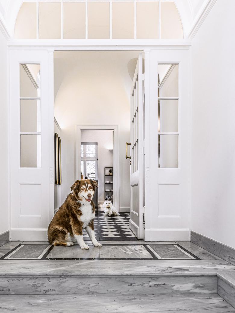 Dem Wunsch der Bauherren, den ursprünglichen Charakter des Gebäudes herauszustellen, sind die Innenarchitekten bis ins kleinste Detail gefolgt. Obgleich das Haus komplett renoviert wurde, konnten bedeutende Elemente des Alten erhalten und in den Originalzustand zurückversetzt werden. Spuren der vergangenen Jahrzehnte wurden teilweise erhalten, manches Mal jedoch auch entfernt: Böden, die nachträglich hinzugefügt waren, wurden durch Fischgrätparkett sowie Naturstein- und Marmorböden mit Schachbrettmuster ersetzt. Nachträgliche Ergänzungen des Stucks wurden entfernt, die Treppe und Türen restauriert.