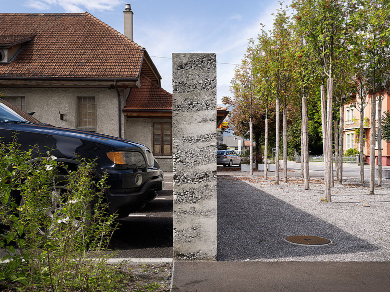 Die Raiffeisenbank Meiringen steht nahe beim Bahnhof an der Hauptstrasse nach Brienz. Nach der Sanierung des Hauses von 1927 und der Errichtung eines rückwärtigen Anbaus bleibt die Baulücke zum benachbarten alten Tramdepot offen. Für den hier geplanten Autoparkplatz und Velounterstand gibt die Bauherrschaft eine Gestaltung mit volumetrischer Qualität und öffentlichem Charakter in Auftrag. An der Strasse wird ein kleiner Mergelplatz präzise angelegt. An seiner Rückseite ragt eine Stampfbetonmauer empor, deren Schichtung an ein geologisches Fundstück erinnert. Die Mauerkrone liegt mit 1.84 bis 1.88 Meter bewusst knapp über dem Augenhorizont. Die dahinter parkierten Autos werden ausgeblendet, der Blick nach oben bleibt ungestört. Zwischen dem Horizont, der Schichtung des Betons und der Bergkulisse entfaltet sich ein Dialog. Auf dem Mergelplatz wird ein Wäldchen aus hochstämmig gezogenen Vogelbeerbäumen gesetzt. Die lokal verbreiteten Bäume mischen sich mit ihrem ungewohnt anmutigen Wuchs und den zu einem Dach verwachsenen Kronen ins Gespräch der Horizonte. Eine breite Ligusterhecke grenzt winkelförmig den Parkplatz vom Bankgebäude und vom dahinter liegenden Kinderspielplatz ab. Sie wird von der Rückwand des Velounterstandes unterbrochen. Ein Ornament aus in die Schalung eingelegten Blättern zeichnet die Hecke auf der Betonwand nach.