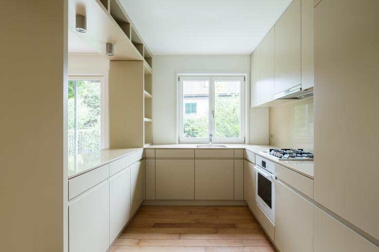 Im Erdgeschoss wurden Küche, Essen und Wohnen miteinander verbunden, ohne die alte Raumaufteilung zu negieren. Die Küche als neu eingefügter Raumbereich wurde zum Herz des erneuerten Hauses. Im neu ausgebauten Dachraum entstand eine zusätzliche grosszügige Wohnfläche.