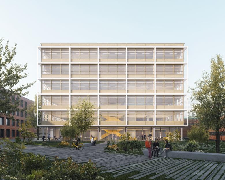 Der zentrale Grünraum wird durch den Neubau stadträumlich gefasst. Wie die Häuser 5 und 6 wird auch der neue Laborbau von diesem zentralen Freiraum erschlossen.