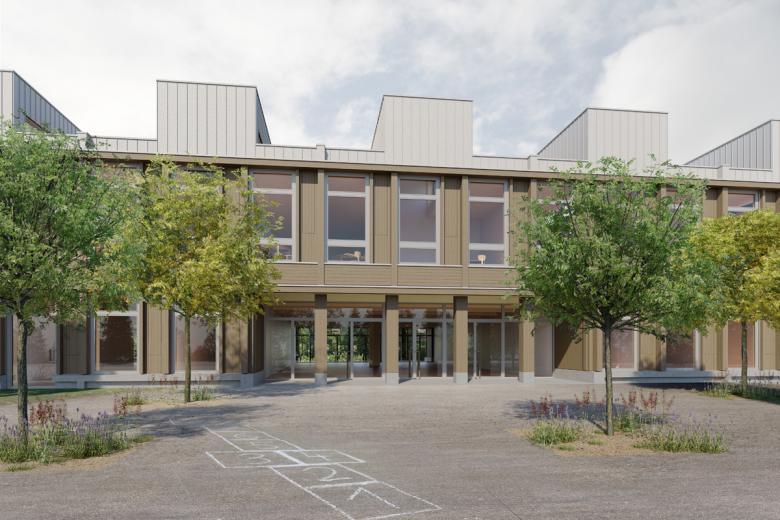 Der längliche Holzbau bildet den Abschluss zum Wohnquartier und schafft eine identitätsstiftende «grüne Mitte» für den Schulcampus. Eine Esplanade mit Baumallee begleitet das Schulhaus. Im Erdgeschoss liegen Kindergarten und Lehrerbereich. Vom zentralen Foyer führen zwei Treppen ins Obergeschoss. Dieses bildet eine durchgängige, vielfältig bespielbare Lernlandschaft, welche über die Tragstruktur des Daches belichtet wird. Die Turnhalle ist in den Baukörper integriert und wird von Kastenträgern überspannt, welche den Rhythmus der Oberlichter übernehmen.