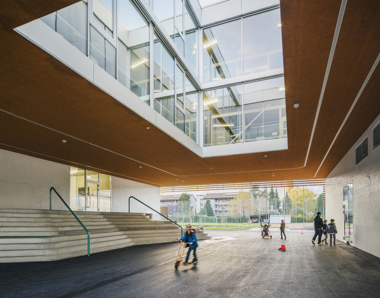 Drei Lichthöfe zentrieren die jeweiligen Nutzungen und bringen viel Tageslicht in den tiefen Baukörper. Der innere Erschliessungsbereich wird klar aufgewertet und kann für flexible und offene Unterrichtsformen genutzt werden. Es sind Orte mit unterschiedlichen Stufen von Intimität und Öffentlichkeit, die als Räume ohne spezifische Funktion die pädagogischen Möglichkeiten erweitern und Orte der schulischen Begegnung schaffen.