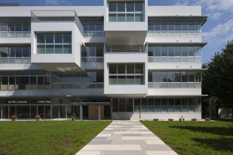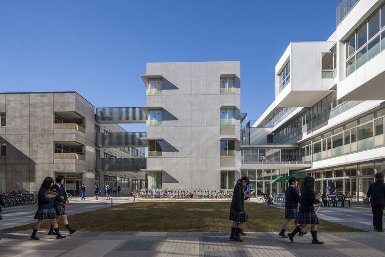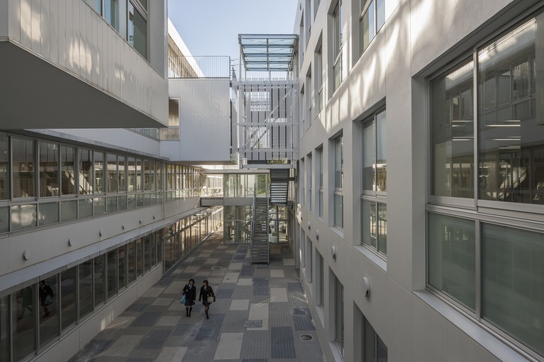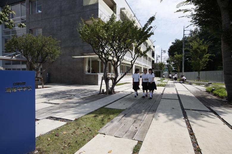 学園の一画に新設された中高一貫校。リニアな校舎棟が挟み込んだボイドスペースを様々に利用していくことで徐々に建て替えていく計画で、清修中学校はその第1期にあたる。校舎中央の大きな吹き抜け空間は、すべてのクラスが一つ屋根の下で学ぶ「ラーニングアトリウム」と名付けられた自由に交流できる新しい教育の象徴的な空間。この大きな空間は、日差しで温められた空気で暖房し、最上部の窓で建物全体の自然通風を行うことができる。
