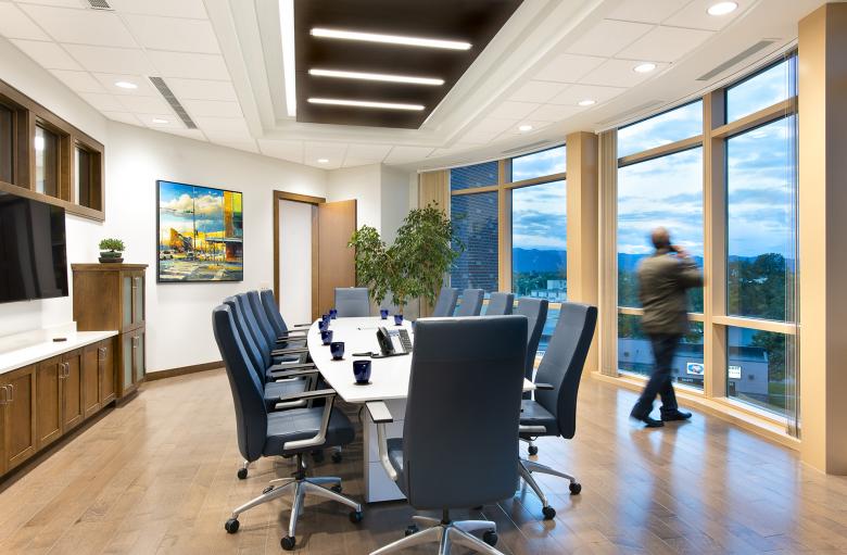 Stockman Bank’s Missoula tower achieved LEED v4 Platinum status. Sustainability measures for the low energy-use per square foot building (modeled with an EUI of 23) include 69% potable water reduction by harvesting rainwater for toilets and stormwater for irrigation, an open-loop ground source heat pump system, chilled beams, and a 48.75 kW photovoltaic array. To encourage environmentally-friendly commuting, the design also includes covered bicycle parking and electric vehicle charging stations.