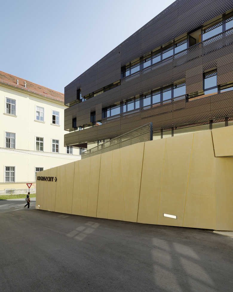 Das Projekt „Pavoreal“ für den Grazer Pfauengarten versucht die Frage der Einfügung neuer Volumina in ein sensibles Altstadtgefüge grundsätzlich und exemplarisch zu beantworten. Einfache Schritte rufen überraschende und komplexe Wirkungen hervor: Das bestehende Niveau, das unter der Krone der historischen Befestigungsmauer liegt, wird mit einem neuen Plateau überbaut. Dieses Plateau wird zwar einerseits mit einer deutlichen Fuge von der Stadtmauer - deren Charakter dadurch massiv gestärkt wirkt - abgerückt, erlaubt aber andererseits einen ungehinderten Blick in und über den Stadtpark, wie er in dieser Form bisher nicht möglich war. Das städtebaulich attraktive Programm wird in drei einzeln stehende Häuser gegliedert: in ein Hotel und zwei Wohngebäude. Diese Strategie erlaubt eine sensible Gliederung und Einbettung der Gesamtbaumasse in das historische Stadtgefüge. Das Projekt wird als städtische Komposition dreier einzelner Häuser erlebt. Jedes der Häuser nimmt unterschiedliche städtebauliche Bezugslinien auf und reagiert unterschiedlich auf die jeweiligen stadträumlichen Situationen. Am wesentlichsten erscheint jedoch, dass alle bisherigen Blickbezüge nach wie vor möglich sind: der Blick vom Stadtpark zum Grazer Uhrturm, der Blick vom Stadtpark auf das Dach des Landesarchivs mit dem dahinter liegenden Schlossberg und der Blick vom Karmeliterplatz in die Baumkronen des tiefer liegenden Stadtparks. In der sensiblen Zone des Übergangs von Altstadt zu Stadtpark, die trotz ihrer Lage innerhalb der Befestigungsmauern nie bebaut war, werden rautenförmige Grundrisse entwickelt, die weniger auf klassische Gebäudetypologien Bezug nehmen als vielmehr auf die geknickten, polygonalen Verläufe der ehemaligen Befestigungsanlagen. Vom Stadtpark aus erscheinen die Baukörper daher äußerst schlank sowie zurückweichend und belassen der historischen Stadtmauer ihre Dominanz. Der Karmeliterplatz hingegen wird nach Osten hin geschlossen bei gleichzeitigem Erhalt seines Bezugs zum Stadtpark. Sowohl Fassaden- als auch Dachflächen werden farblich an die charakteristische ziegelrote Dachlandschaft der Grazer Altstadt angeglichen. Ein Wasserbecken zieht sich in Reminiszenz an den historischen Burggraben entlang der gesamten Länge der historischen Stadtmauer. Die Uferkante zum Park bildet Buchten zum Verweilen und wurde durch den Schattenwurf der neuen Gebäude gebildet. So wird zweimal im Jahr der Schatten exakt auf die Wasseroberfläche treffen: Die Architektur der Gebäude tritt in Bezug zur Architektur der Landschaft.