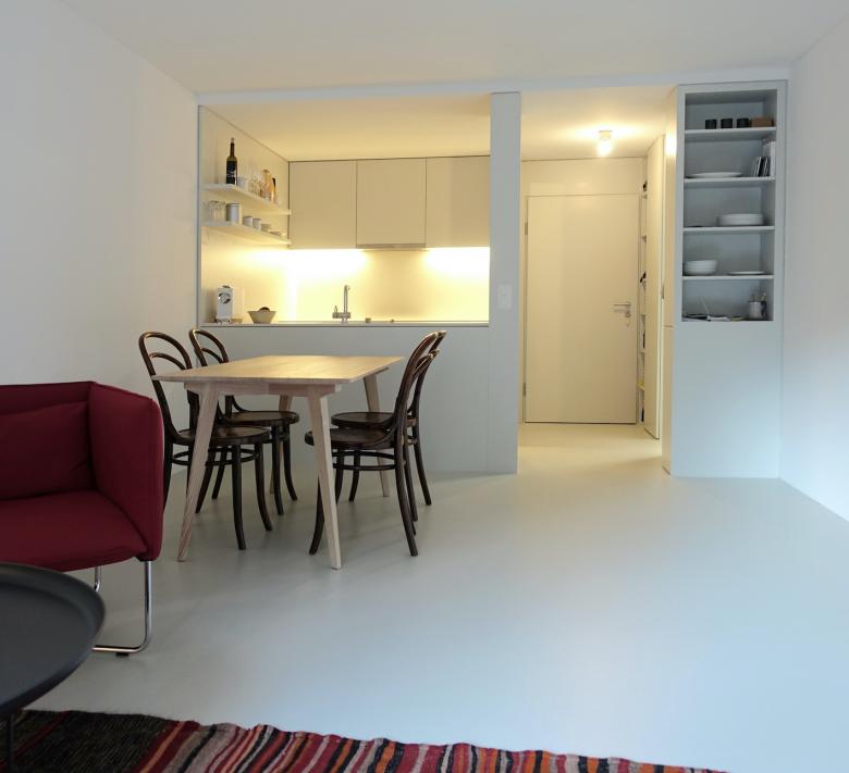 Durch das Öffnen der kleinen, fensterlosen Küche zum Wohn-/Essraum und durch die Materialwahl konnte eine helle heitere Stimmung erzeugt werden.
