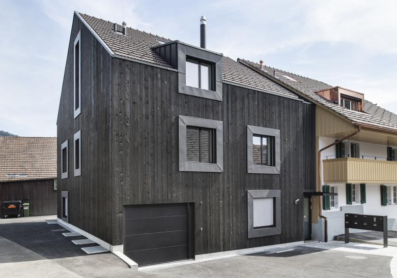 Der historische Altbau wurde nach denkmalpflegerischen Kriterien renoviert. Das neue Farbkonzept orientierte sich an der ursprünglichen Farbkonzeption, welche aufgrund einer Farbanalyse freigelegt werden konnte. Anstelle des alten Schopfes wurde auf der Rückseite ein zeitgemässer Holzbau gelenkig angefügt. Das fast schwarze Holz sowie die Lochbefensterung mit Blecheinfassungen korrespondieren mit den alten Umgebungsbauten in der dörflichen Dichte des Oberdorfes.