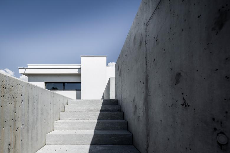 Dem Entwurf liegt die Idee des Rückens zugrunde, der das Grundstück in zwei Bereiche gliedert: Einen hangseitigen, öffentlichen, Bereich, der den Hauseingang, die Garagenzufahrt und einen großzügigen, piazzaartigen Innenhof enthält. Ein Ort, der zum Verweilen mit Freunden und Nachbarn einlädt. Selbst das Pferd der Bauherrin findet hier seinen Platz. Und einen talseitigen privaten Bereich, der einen herrlichen Ausblick in die Natur bietet.