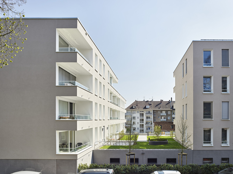Wohnungen – Die neuen Baukörper sind als 3-Spänner konzipiert, die im Regelfall zwei durchgesteckte 3-Zimmer-Wohnungen und eine zum Hof orientierte 2-Zimmer-Wohnung aufnehmen. Durch das Sockelgeschoss aus dem Straßenniveau herausgehoben, präsentieren sich die Wohnungen zum öffentlichen Raum introvertiert, während sich die Wohnräume zum Innenhof hin großzügig öffnen und durch die Loggien erweitert werden.