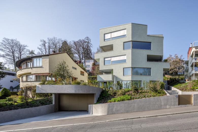 Quergestellt und aus der Reihe springend, verdichten die beiden Wohnbauten das Quartier nach, wobei sie weniger Bezug auf die bestehende Bebauungsstruktur nehmen, sondern eine künftige vorzeichnen. In der Volumetrie differenziert, mit gestalterisch gemeinsamen Grundelementen formuliert, und einer verwandten Farbgebung bedacht, ersetzen neun Wohneinheiten zwei Einfamilienhäuser.