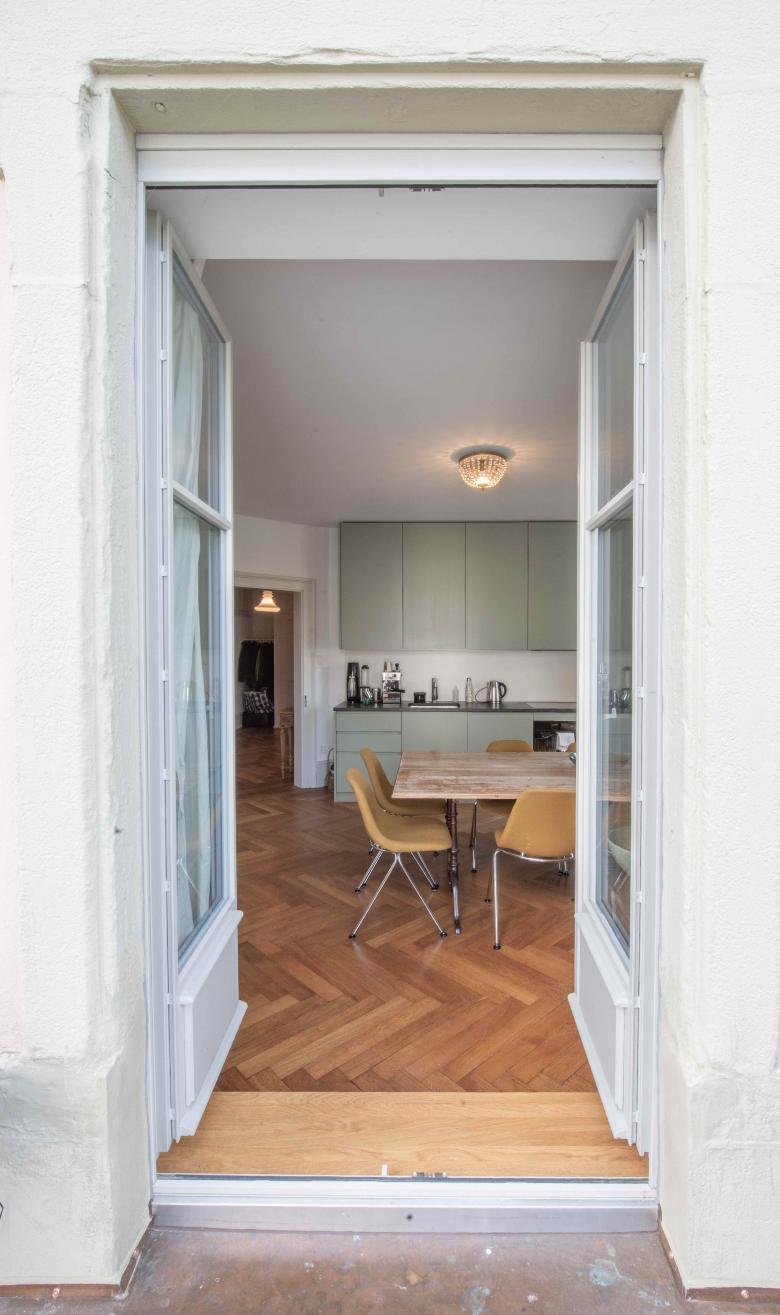Sanierung und Umbau einer Wohnung in einem denkmalgeschützten Gebäude inklusive einer Balkonerweiterung auf einem bestehendem Anbau.