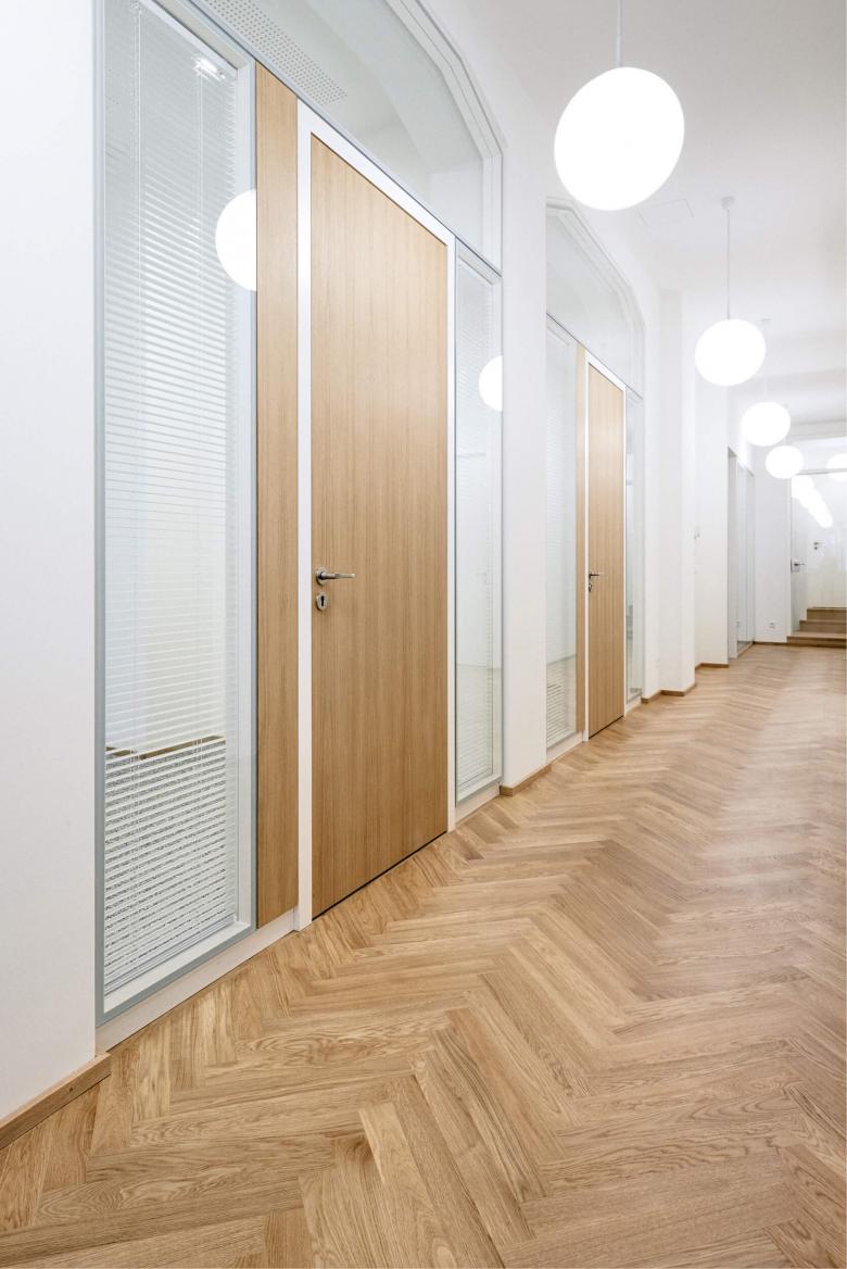 Das Ergebnis der Umnutzung sind völlig neue Raumstrukturen, helle, lichtdurchflutete Büroräume, ausgestattet mit Fischgrätparkett aus Eiche, Haustechnik auf neuem Stand und moderne Glastrennwände, die die Vorstandsräume akustisch diskret trennen, aber doch Transparenz zulassen. Respektiert wurden die abgeschrägten Ecken der Unterzüge, damit die alte Struktur ablesbar bleibt. Und überlebt hat die alte Kellertreppe, die noch die Geschichte erzählt, wie damals die Bierfahrer die Bierfässer in den Keller schleppten.
