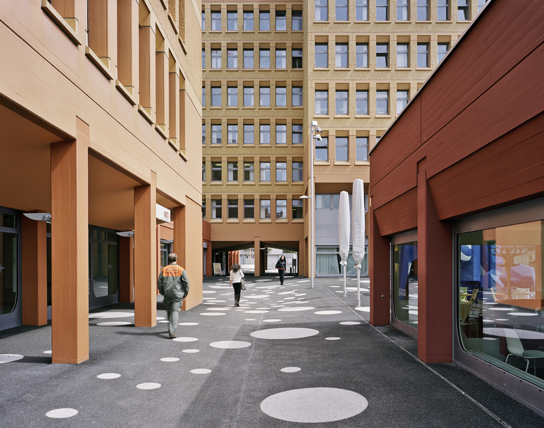 Die drei Publikumsebenen der Anlage sind in ihrer Wirkung gestärkt und über neue grosszügig angelegte Treppenanlagen besser miteinander verbunden worden: Der Garten wird verdichtet, der Platz auf Strassenniveau dagegen räumlich geöffnet und das unterirdische Parkhaus besser in den öffentlichen Raum miteinbezogen. Die einheitliche neue Farbgebung beruht auf dem ursprünglichen Farbkonzept und lässt mit dem neuen Goldschimmer auf den groben Putzflächen und im Zusammenwirken mit weiteren gestalterischen Massnahmen die massigen Dorflindebauten wesentlich leichter und zeitgemässer erscheinen.