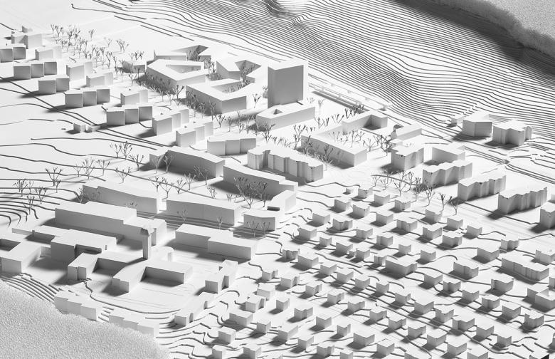 Städtebauliche Planung Zentrumsentwicklung / Am Fusse des Gurten, des Berner Hausbergs im Süden der Stadt, bedingt ein geplanter Knoten aus S-Bahn, Tram und Bus 20 Hektar Siedlungsrand neu zu ordnen. Um die betreffenden Teilgebiete hier, entlang der Ausfallachse Seftigenstrasse, mit den geforderten 2'000 Büroarbeitsplätzen, 300 Wohnungen, Einzelhandelsflächen und Infrastruktur stadträumlich zu "befestigen", werden sie von ihren jeweiligen Rändern her besetzt: