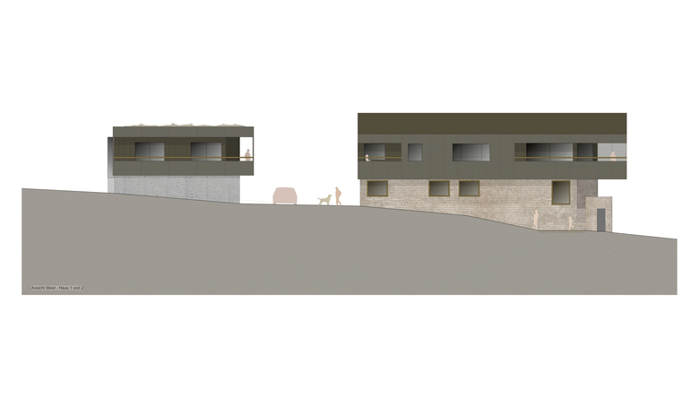 Der Hof "Fluck", auf der Hangkante über dem Sempachersee gelegen, soll neu errichtet werden. Anstelle des Ensembles von Scheune, Bauernhaus und Stall, ist eine zweiteilige Ecklösung mit der grossen, alten Linde geplant.