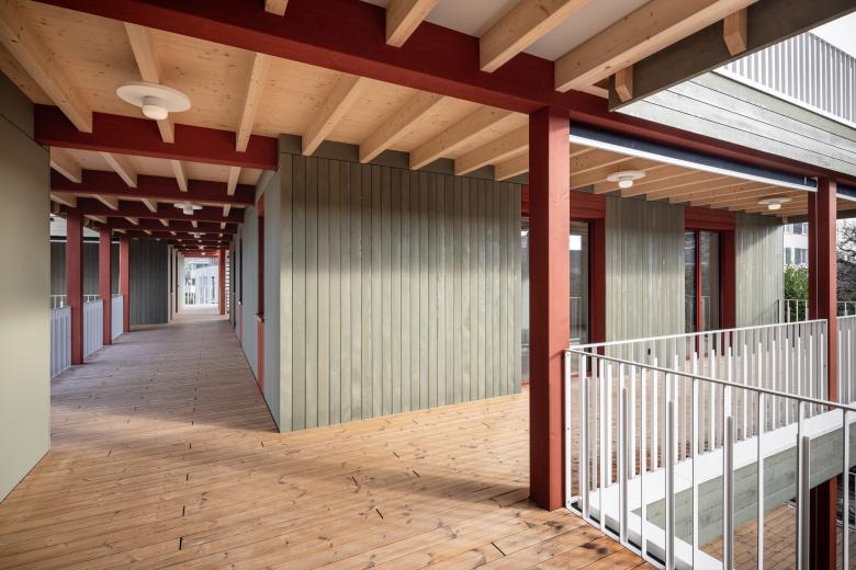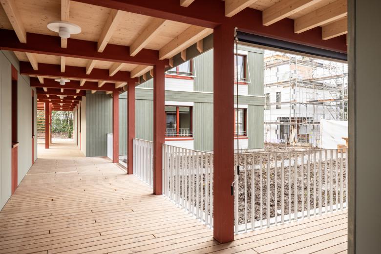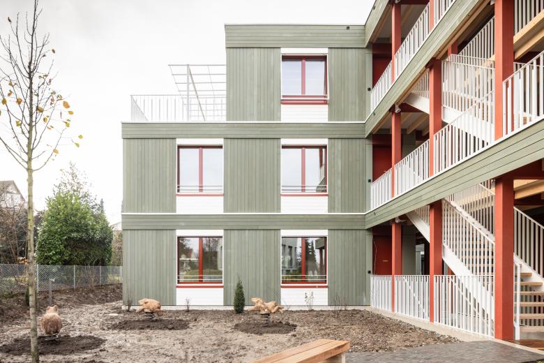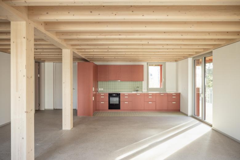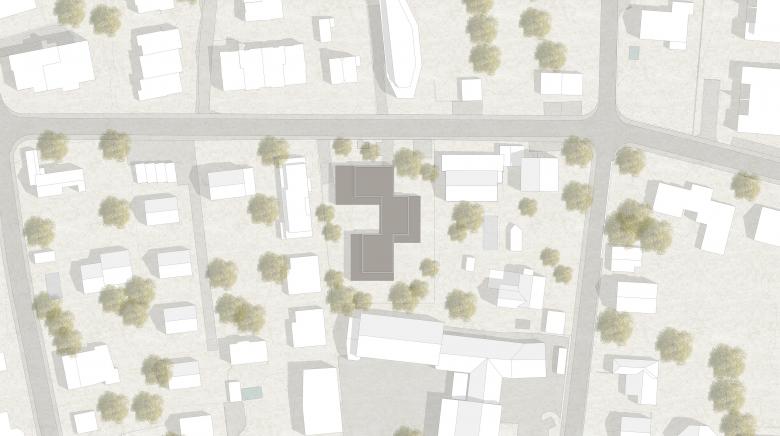 Die Volumetrie der neuen Wohnüberbauung wird auf drei dreigeschossige Gebäudekörper verteilt die versetzt zueinander angeordnet werden. Durch die Vor-und Rücksprünge verzahnt sich das Gebäude in der Umgebung und schafft eine für das Einfamilienhausquartier angemessene Massstäblichkeit. Die Staffelung der Gebäudekörper lässt den Grünraum nahe an das Gebäude treten, wodurch eine symbiotische Verbindung zwischen Architektur und Natur entsteht. Der Zugang zur neuen Wohnüberbauung erfolgt durch ein stufenweises Annähern. Vom öffentlichen Raum gelangt man zunächst in die halböffentliche Erschliessungszone, bevor man schließlich den privaten Wohnraum betritt. Die zentral gelegene Erschliessungsachse erstreckt sich über die ganze Gebäudetiefe und verbindet die einzelnen Volumen miteinander. Sie ist das Herzstück der Überbauung und dient neben der Erschliessung der einzelnen Wohnungen auch als Ort der Begegnung und des Austauschs. Der Neubau ist als konsequenter Holzbau konzipiert. Das sichtbare statische Tragwerk und die präzise tektonische Fügung der einzelnen Bauteile bestimmen das äussere Erscheinungsbild. Die Gebäudehülle besteht aus einer vertikalen Holzschalung in einem zurückhaltenden Grünton. Im Bereich der Deckenstirn ändert sich die Schalungsrichtung, wodurch die facettenreichen Konturen des Gebäudes zusätzlich hervorgehoben werden. Das sichtbare Tragwerk setzt sich auch im Innern der Wohnungen fort. Die klaren und prägnanten Grundrisse sind auf die statische Struktur abgestimmt, welche die Wohnungen charakterisiert und ihnen ihren individuellen Ausdruck verleiht.