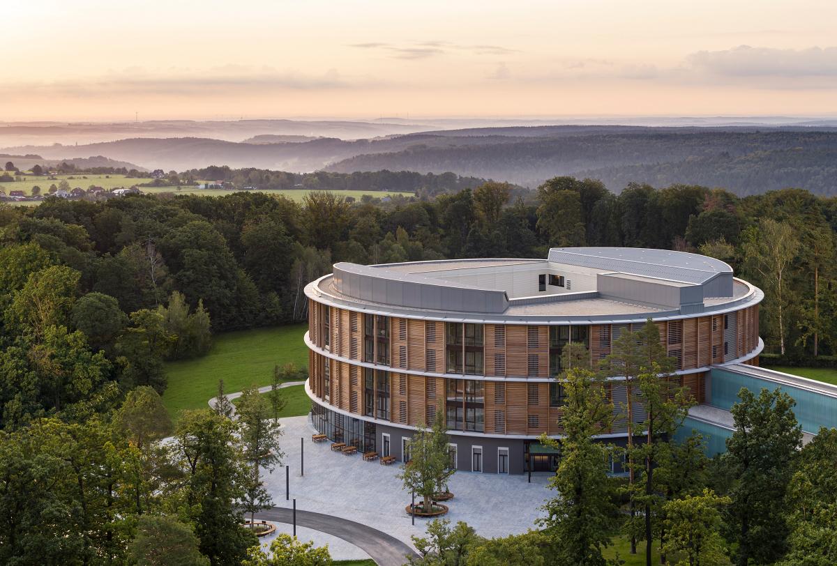 The façade of the round Waldkliniken Eisenberg building is made of wood from the region. (©Telluride Architektur, Matteo Thun & Partners | Photo: HGEsch)