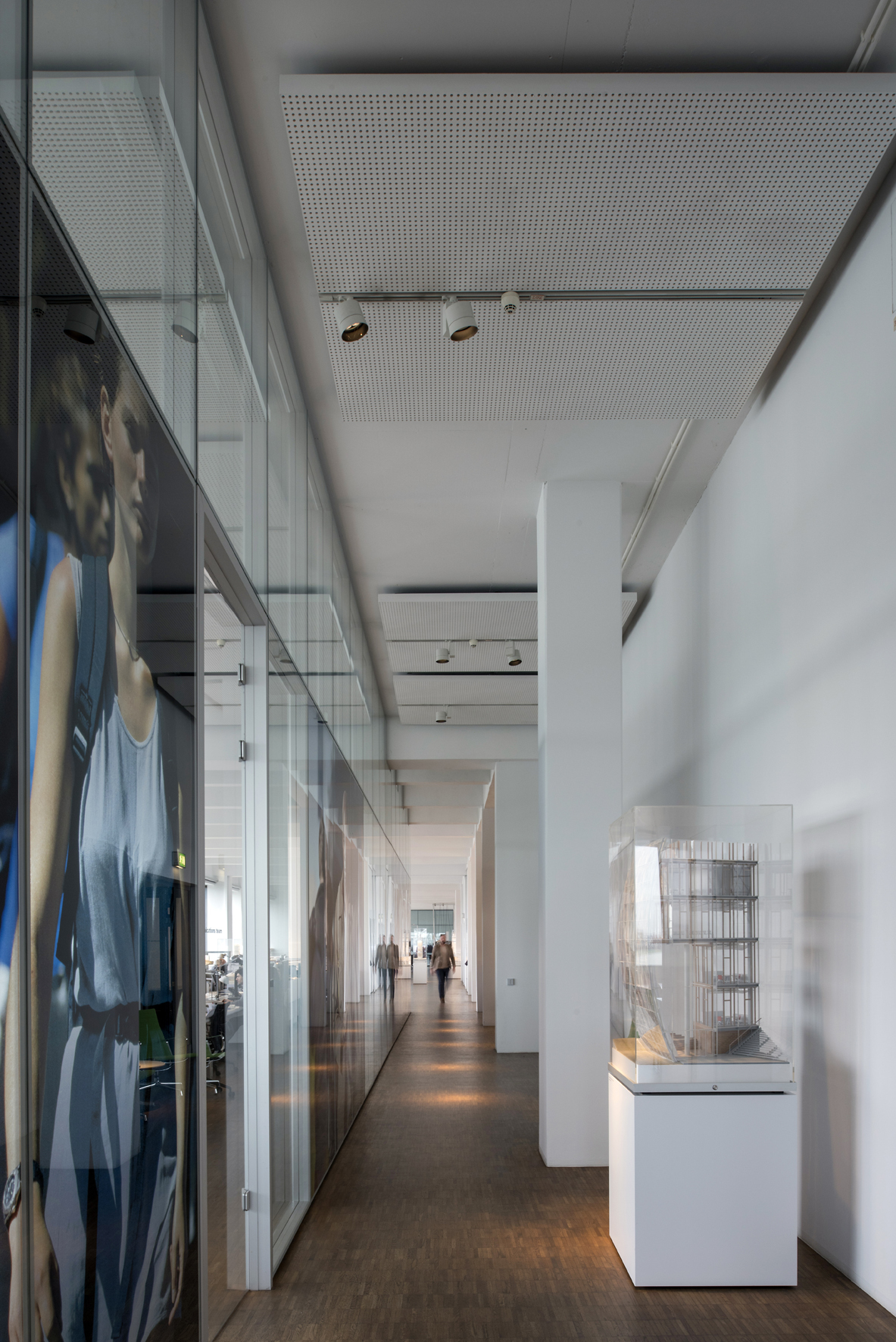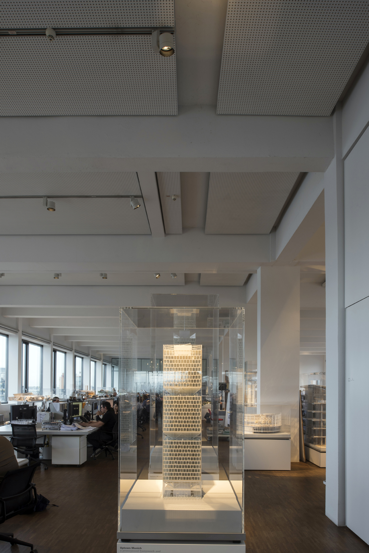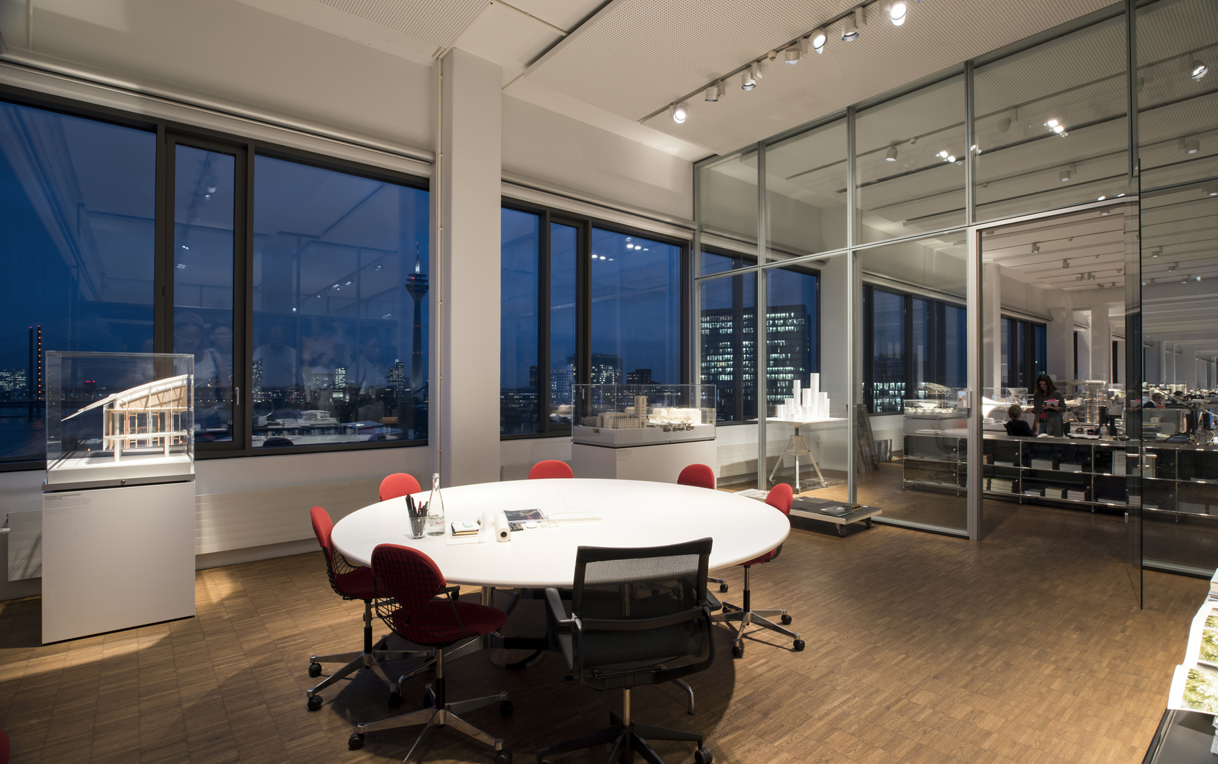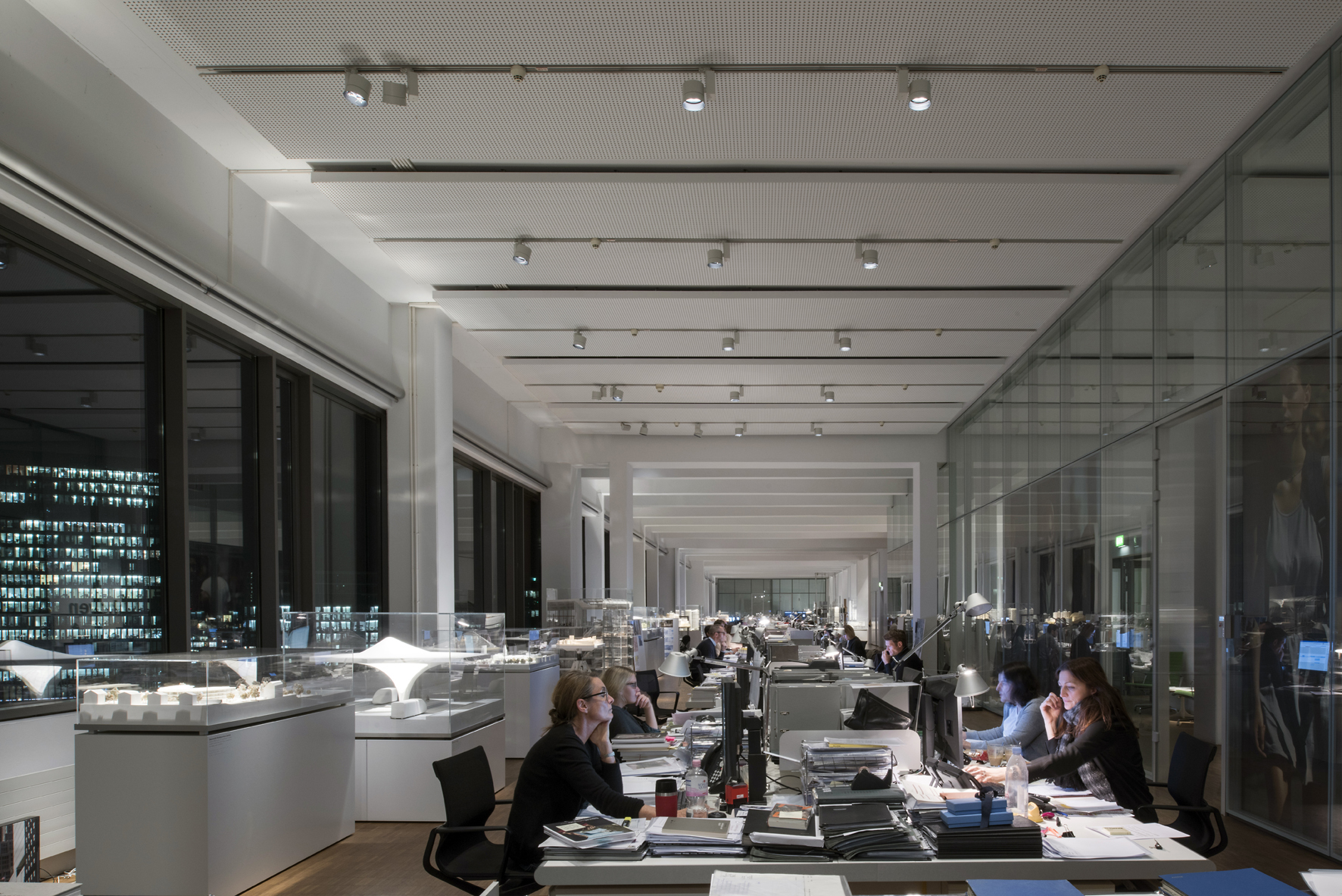 Instead of uniform general lighting, ingenhoven architects use zonal lighting with a warm white light 3000K color. The connected load of the Optec spotlights is only 8 or 24 watts. Last but not least, the accent light lends special attention to the visually stimulating architectural models and provides exciting focal points within the modern office environment.