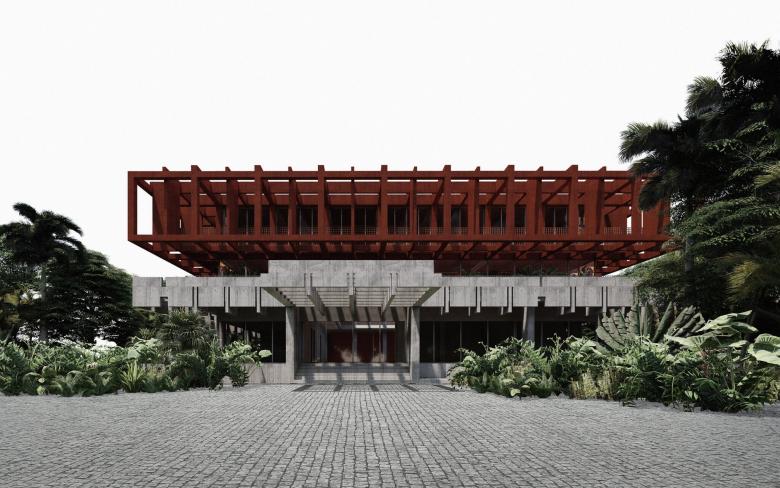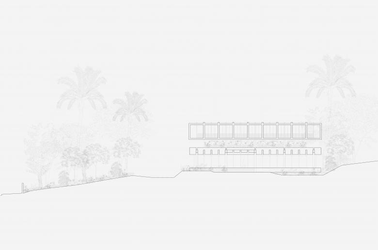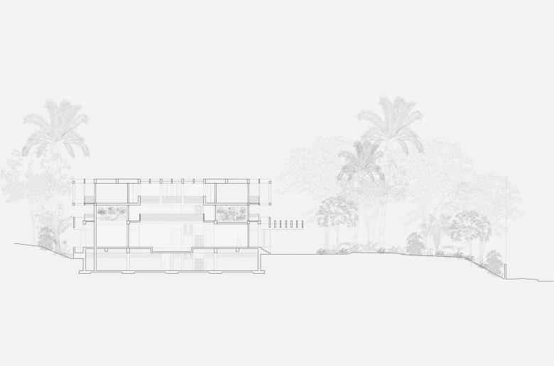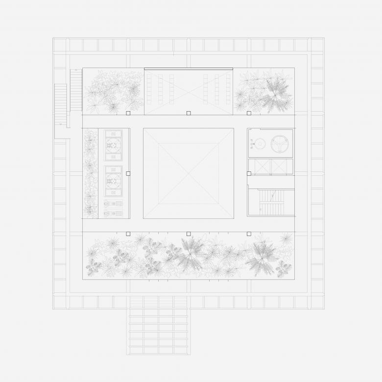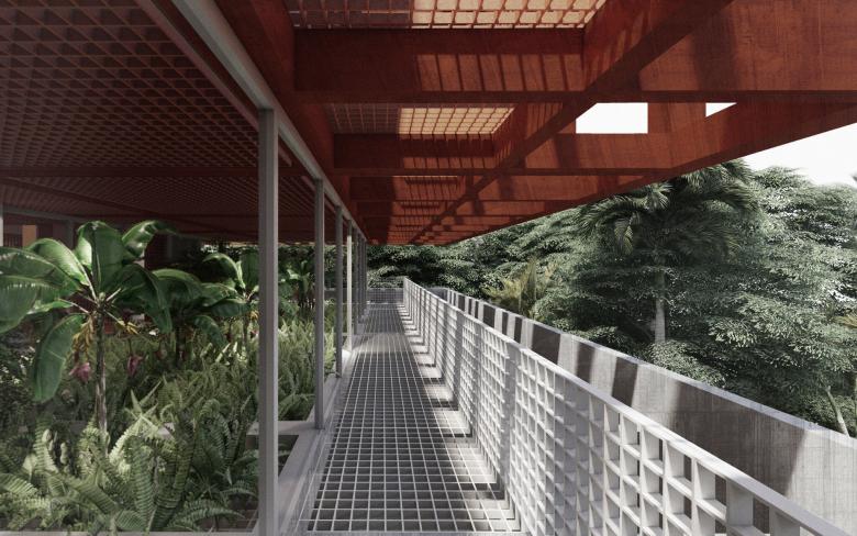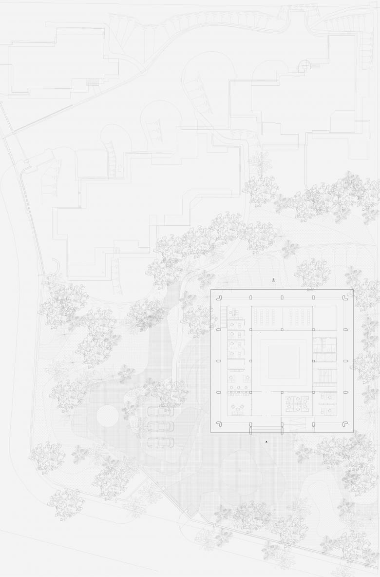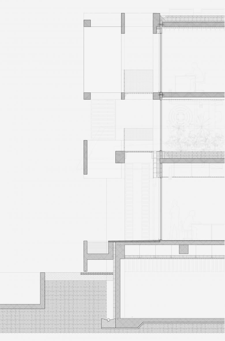 Das neue Gebäude wird um einen neuen Baukörper erweitert, der selbstverständlich über dem Bestand zu schweben scheint. Zwischen dem neuen und dem bestehenden Baukörper wird das Green-House, welches für Innovation und Nachhaltigkeit steht, als Zwischenebene eingeführt. Das eingeschobene Zwischengeschoss ist visuell zurückversetzt, wohingegen das Obergeschoss eine nach Aussen akzentuierte Struktur zeigt. Das Obergeschoss nimmt die Struktur des Bestandes auf und stützt auf dieser ab. Das Konzept ist deutlich lesbar und verständlich und steht damit für Transparenz und Offenheit. Die Luftverschmutzung und Smog sind eine akute Problematik in Singapur. Singapur verfolgt das stadtplanerische Ziel, die natürliche, tropische Umgebung mit dem Baumbestand zu verbinden, weshalb das Stadtbild von Strassenbäumen, Grünanlagen, Parks und Fassadenbegrünung geprägt ist. Der Entwurf für die Schweizer Kanzlei möchte dieses sehr aktuelle und wichtige klimapolitisches Thema aufnehmen und einen Beitrag für ein technisches, architektonisches und innovatives Gebäude leisten. Das Green-House ist die Lunge des Gebäudes, spannt sich zwischen dem neuen und alten Gebäudeteil auf, und sorgt für eine natürliche Luftreinigung durch Innenraumbepflanzung. Die Luft wird durch das Gewächshaus gefiltert, dieses dient quasi als Sauerstofftank, und die Pflanzen geben den gereinigten Sauerstoff mit stark verringertem Kohlenstoffdioxid durch die Lüftungsanlage in jeden Bereich des Hauses. Die stark verschmutze Luft wird natürlich gereinigt.