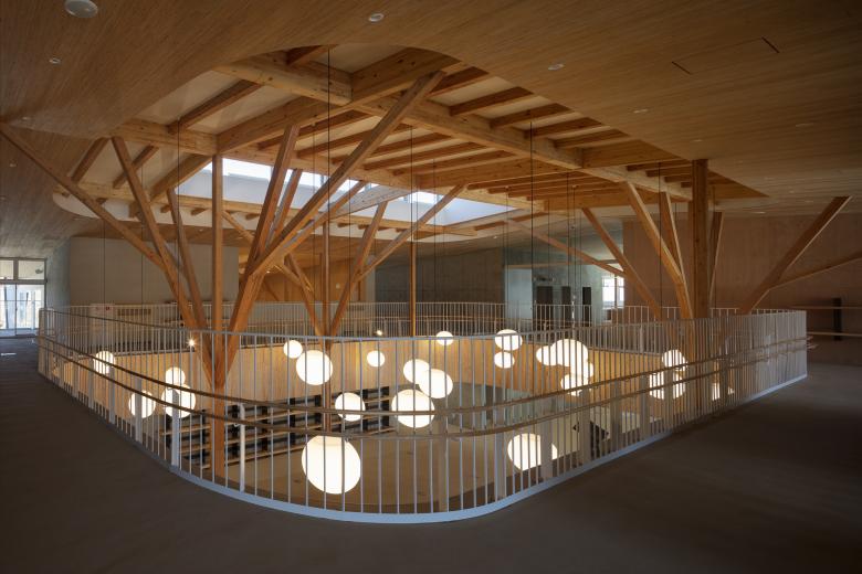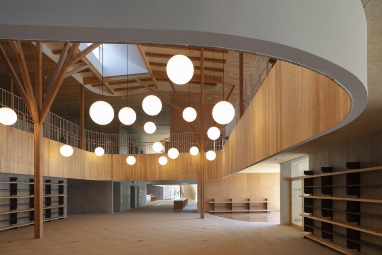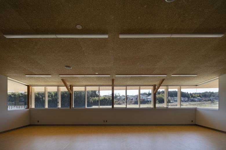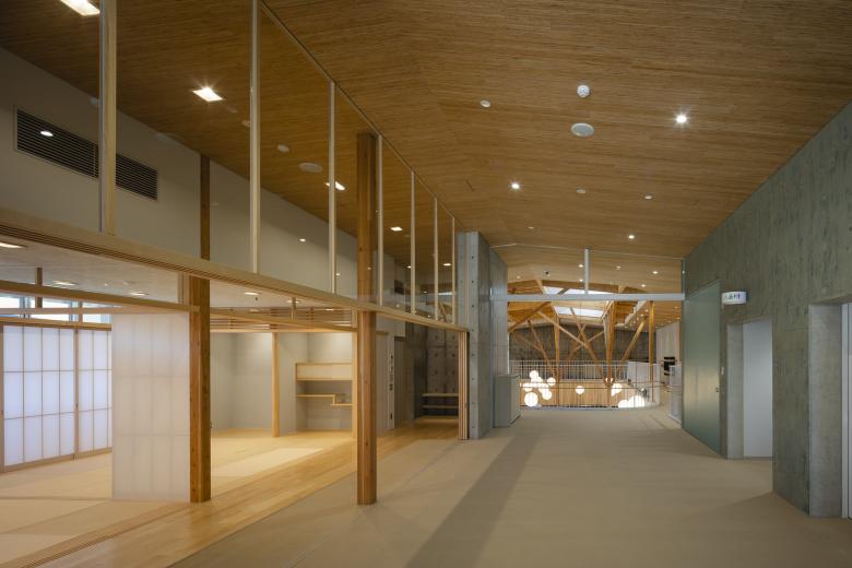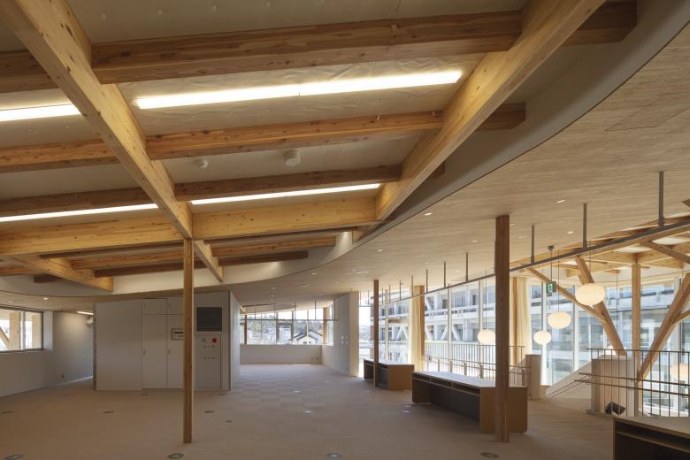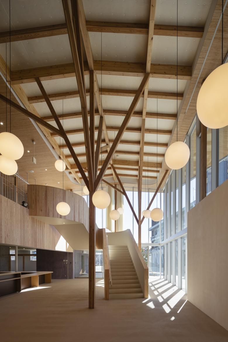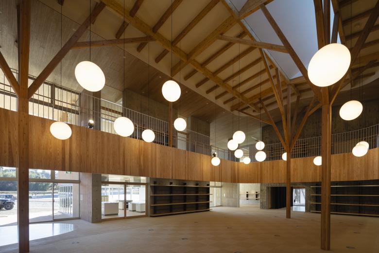 建物の全体構成は、東に支所、西に交流館の領域をまとめた。合築という性格上、双方の独立性と親和性が求められた。建物の出入口は支所側にある。吹き抜けのある支所待合と図書コーナーは、諸室を緩やかに繋ぐハブとし、双方の中間に交流館事務をおいて管理区画を明確にした。貸室は未使用時に閉鎖されるため、自然の光と風を導く共用部と交互に配置して、いつでも自由に使える活動領域が建物全体に行き渡るよう配慮した。