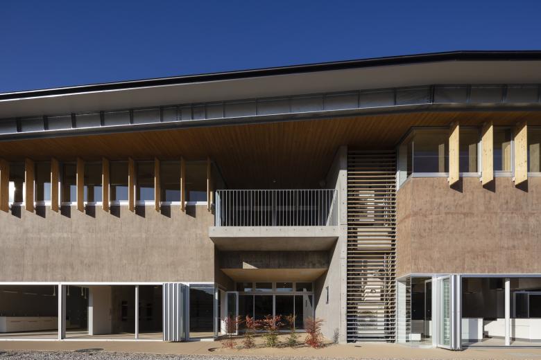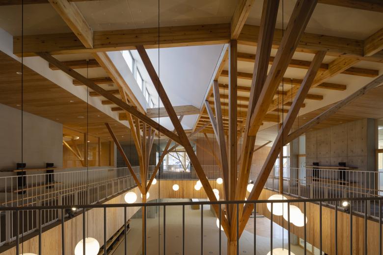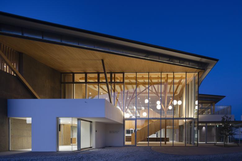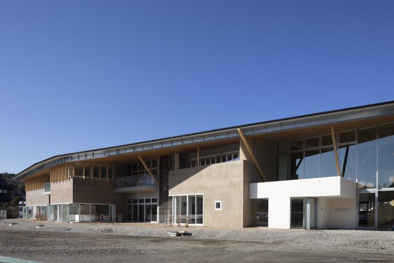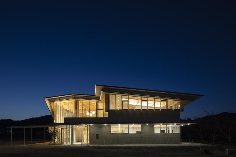 敷地内にバスターミナルも設けた支所と交流館の合築で、木造と鉄筋コンクリート造、一部鉄骨造の混構造による2階建ての建築である。