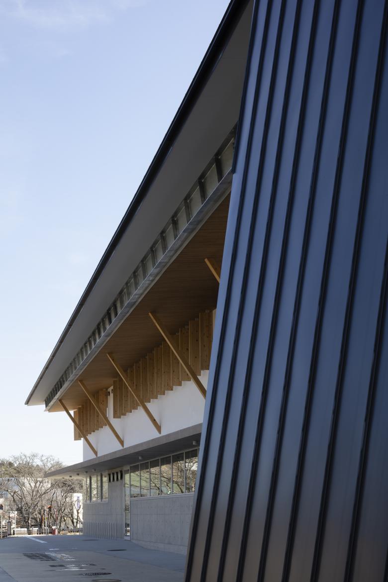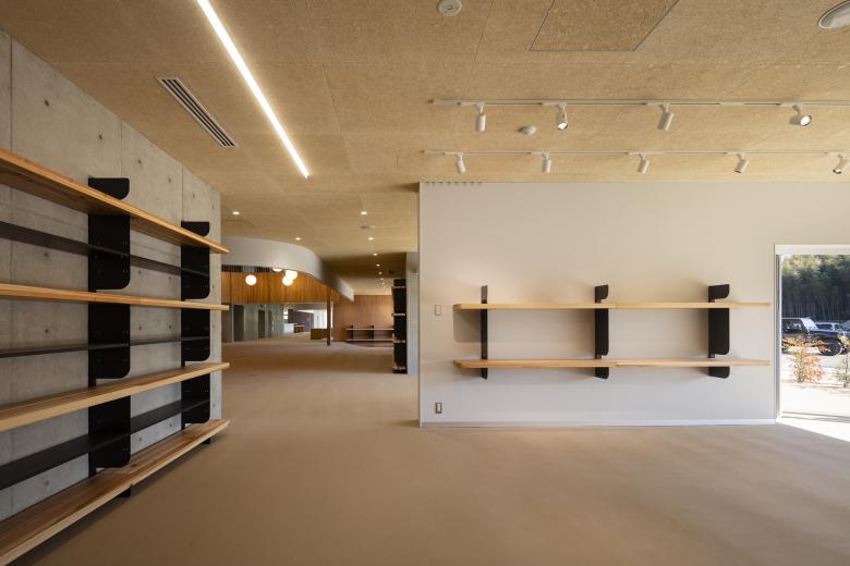 また、性格の異なる諸室を木造の大屋根で覆うことで、様々なお店が集まり1つの場を創り出す市場のような空間を目指した。大屋根は、樹状の木柱とコンクリートの壁で支えられた軒の深い切妻屋根である。領域ごとに塗り分けた木目のコンクリート壁は、色彩が壁の輪郭を明瞭にし、空間に奥行きを与える。様々な色彩と素材が混在する空間の斑な質感が、既存の備品を持ち込む室内に調和をもたらす。敷地からは猿投山や飯野川などの借景が豊かだ。藤岡の植生で彩られた庭と遊歩道も来春には完成し、周辺と調和した景観を整える。