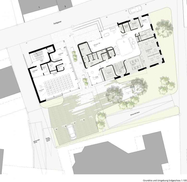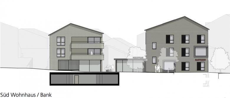 Die Aufgabestellung beschreibt ein umfangreiches Raumprogramm für den Hauptsitz der Raiffeisenbank. Neben dem neuen Auftritt der Bank, schaffen die Neubauten eine neue ortsbauliche Prägung an diesem zentralen Ortsteil.