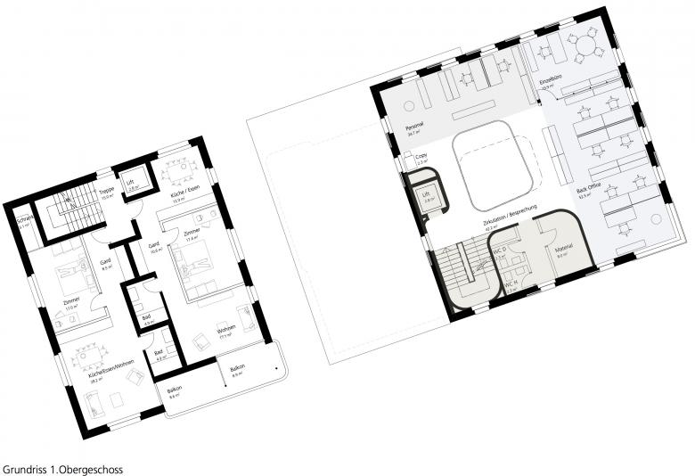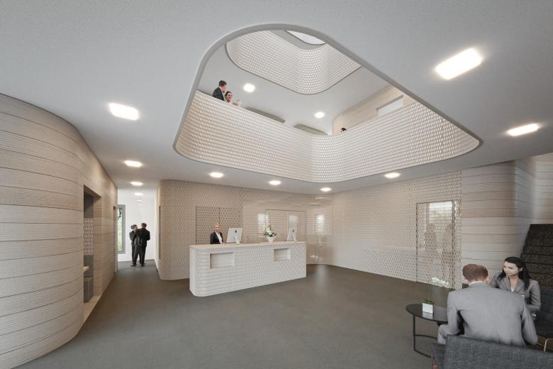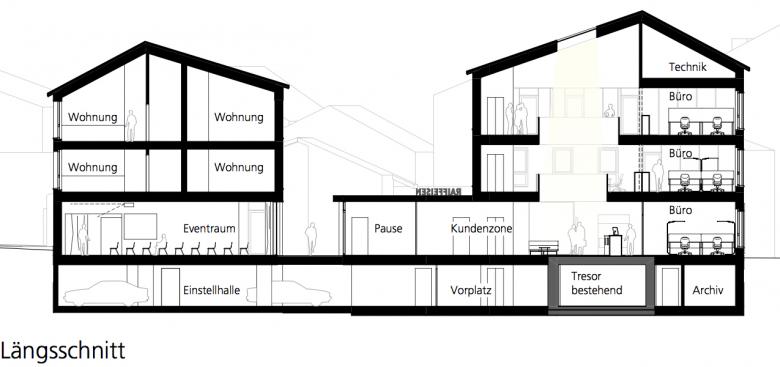 Der Bankhauptsitz erhält im Erdgeschoss den Kundenbereich, welcher durch den grossen inneren Lichthof, mit den zwei oberen Verwaltungsebenen räumlich verbunden bleibt.