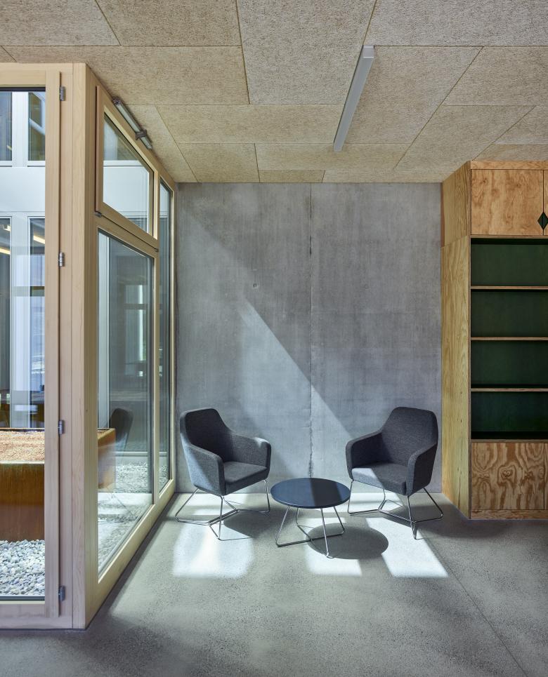 Ausgangslage der Organisation des Schulhauses ist der Unterrichtscluster aus einem Schulzimmer und einem Gruppenraum. Dieser organisiert sich um einen „vertikalen Clustergarten“ welcher die Unterrichts- und Aufenthaltsräume zoniert. Alle Schulzimmer werden über die Fassade und den zugehörigen „vertikalen Clustergarten“ ohne mechanische Lüftung quergelüftet. Im Innern sorgen natürliche Materialien und ihre Farbigkeit für ein angenehmes Lernumfeld.