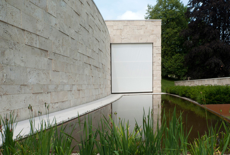 Für den Neubau waren die optimale Verbindung mit dem bestehenden Gebäude, sowie das Einbetten in die Landschaft die wichtigen Parameter. Der lokal vorkommende Kalktuff und die vorgegebene radiale Form der Fassade, geben dem Gebäude eine natürliche Eleganz, die durch das Spiel von verglasten und geschlossenen Flächen und der Präzision der Ausführung hervorgehoben wird.