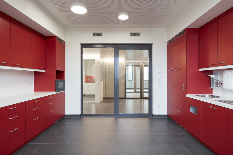 Die Stationen sind im klaren Weiß gehalten, unterbrochen durch die kräftigen Farben der Möbel in den einzelnen Etagen – blau, rot und grün. In den Stationsmitten werden die Pflegestützpunkte, die Speiseräume, die Therapieküche sowie Gruppentherapieräume als zentraler Treffpunkt angeordnet. Durch Glaswände entsteht eine helle Transparenz und gleichzeitig ein hohes Maß an Einsehbarkeit. Vom zentral angeordneten Stützpunkt aus können alle Patientenflure eingesehen werden. Trotz der vielen Sicherheitsmaßnahmen wirken die Stationen wohnlich und freundlich für Patient und Personal.