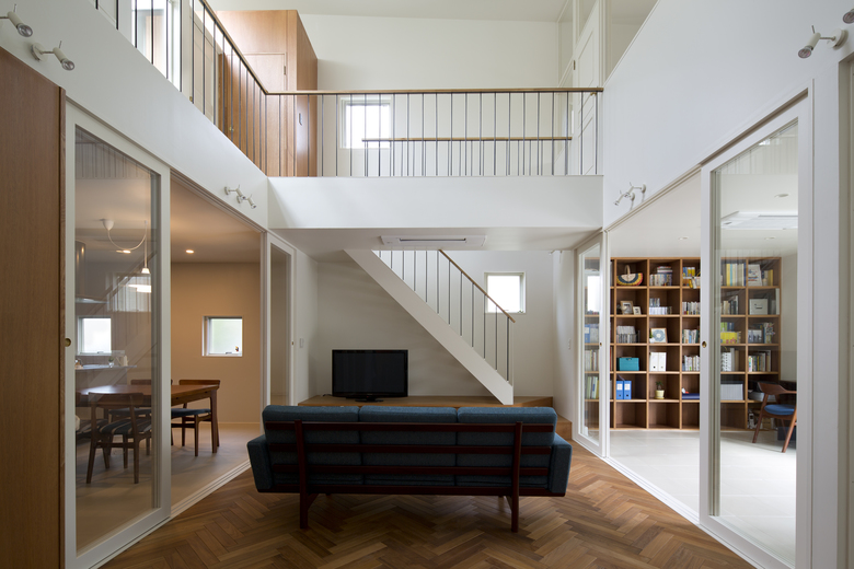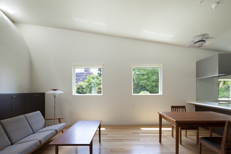 Former national route has heavy traffic, thus building A and B do not have windows on the north. Windows facing the neighbors on the east and west sides are small and minimized, whereas the windows facing the garden are large. Both building A and B have courtyard and skylight with slanted ceiling and curved walls to give varied interior scenes.