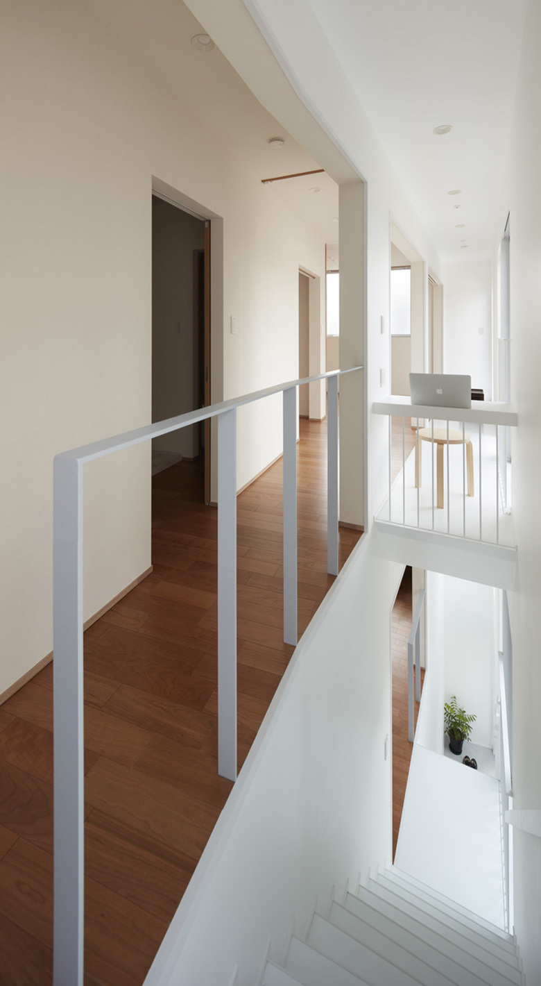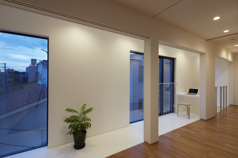 A long three-story flat which consists of 6 dwelling units, 3 studios and 3 duplexes, stands along private passage diverged from the street in front of the premises. Behind the entrance doors of the flat is White Layer, long and thin space whose entire surface is painted in white. Behind the White Layer is living space such as kitchen, dining and living room.