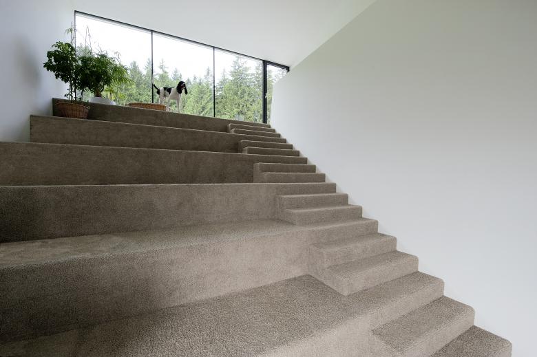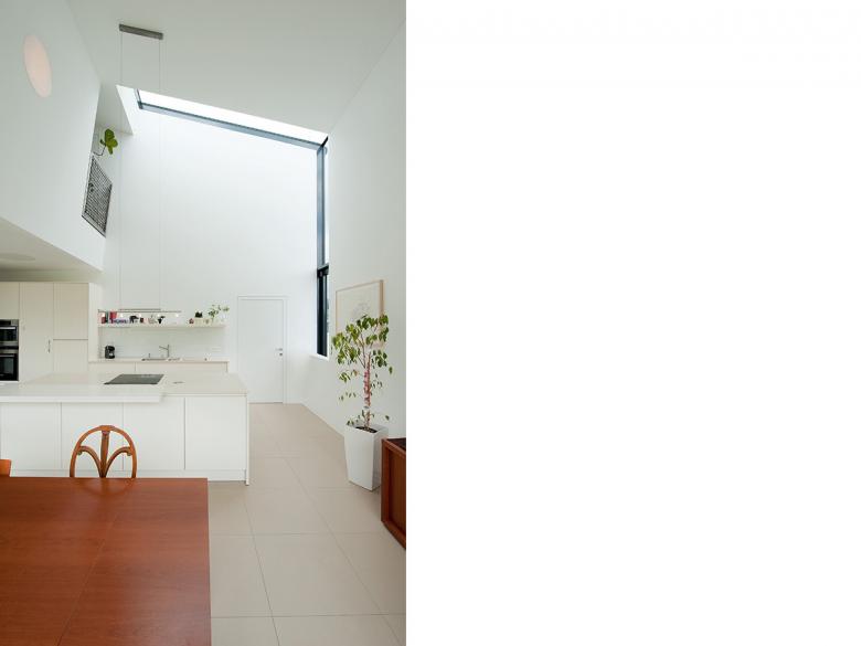 Das Wohnhaus für eine Familie liegt an einem nach Osten abfallendem Hang in stadtnaher Lage zu Linz. Die Topographie des Bauplatzes, Bebauungsvorschriften sowie die Besonnung des Grundstückes waren bestimmende Parameter für den Entwurf und die Konzeption des Hauses. Insgesamt ist die klare, nach Aussen hin monolithisch wirkende struktur in ein komplexes Raumgefüge im Inneren aufgelöst. Die für die Aussenwirkung charakteristischen geneigten Wandscheiben prägen auch den Innenraum – als podestartig abgetreppte „Wohnlandschaft“ bzw. als dynamisch fluchtende Decke. Die verschiedenen Nutzungsbereiche im Erd- und Obergeschoss bilden ein zusammenhängendes räumliches Gefüge. Durch die schrägen, die Durchbrüche in der Höhe und die Verbindungen zwischen oben und unten entsteht der eigentliche räumliche Reichtum, der durch die im Tagesverlauf wechselnde Lichtstimmung noch verstärkt wird. Die sitzstufenartigen Podeste erweitern den Wohnraum und leiten in das Obergeschoß über. Die Nachmittagssonne scheint durch das große Westfenster über den Podesten bis in den Wohnraum.
