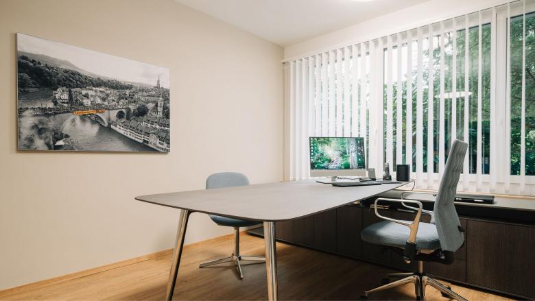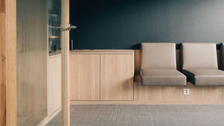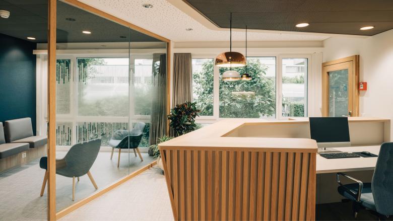Im offen gestalteten Eingangsbereich der Praxis steht eine grosszügige Empfangstheke, mit einem dahinterliegenden räumlich und akustisch abgetrennten Backoffice. Eine neue Wandverglasung separiert den Wartebereich von der Durchgangszone und ermöglicht trotzdem Sichtbezüge und eine räumliche Verbindung und Nähe. Bei den Untersuchungszimmern entsteht eine gemeinsame Vorzone und ein Patienten-WC. Vorhänge und Sichtschutzfolien bieten, wo nötig, Privatsphäre und Blickschutz und tragen zum Wohlbefinden des Patienten bei.