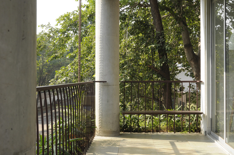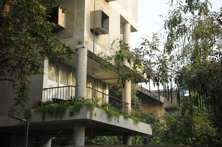 The house in the landscape was recreated from the pieces of a 300 year old haveli. In this structure we merge new and old systems of assembly, combining 18 inch brick walls in concrete frame with gutai lime plaster and restored tel paani finished teakwood elements. The basic form follows the original courtyard layout, flanked by bedroom, kitchen and mezzanine, while the wrapping terrace and sunken entry extend into the spaces outside, to transform the original row house layout into a part of the landscape.