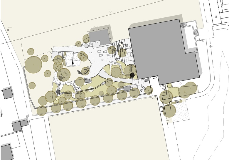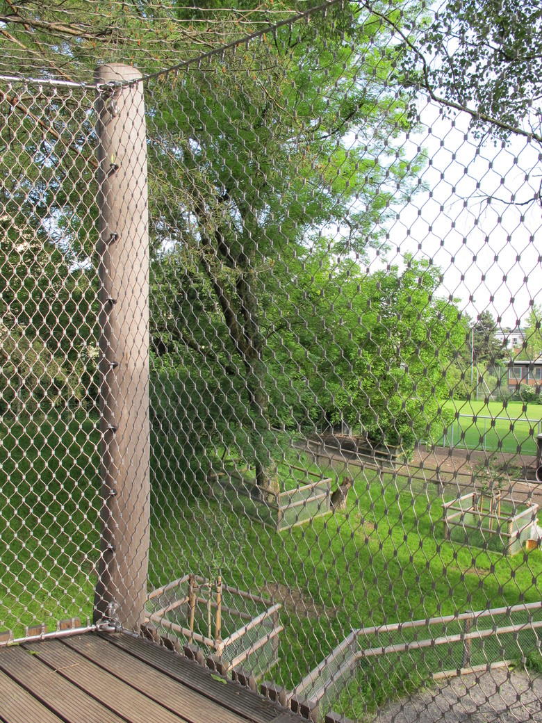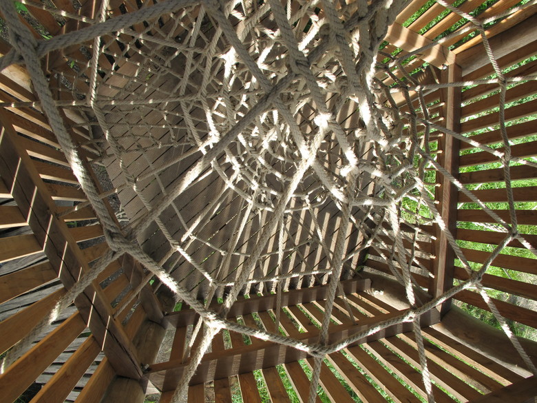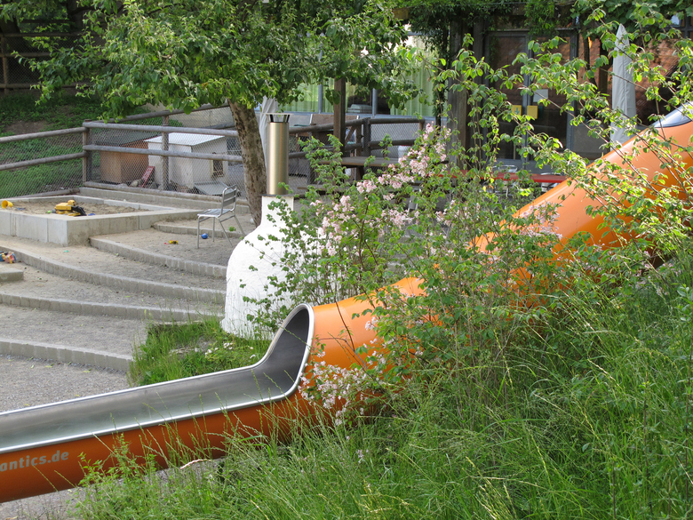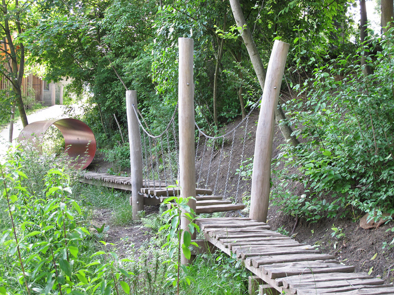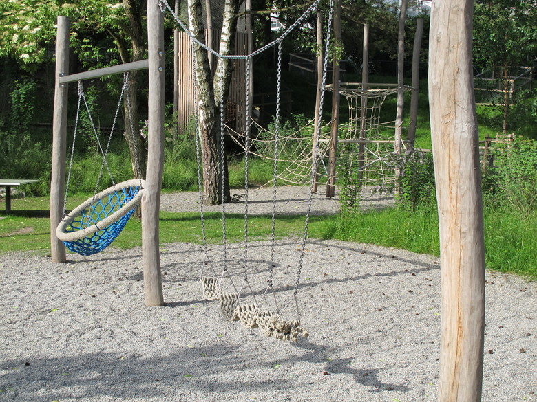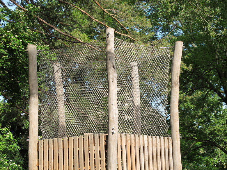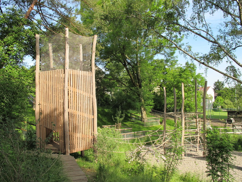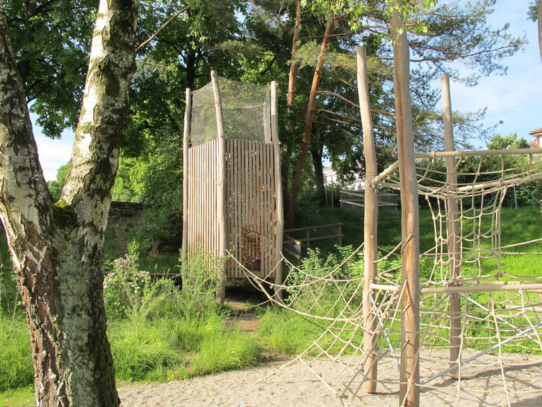 Die bestehenden Klettertürme werden durch neue Türme aus Robinienholz ersetzt. Diese durften von aussen nicht bekletterbar sein, da in den Böschungsbereichen kein Fallschutz möglich ist. Über unterschiedliche Aufstiegsmöglichkeiten können die neue Tunnelrutsche oder eine luftige Aussichtsplattform mit Netzabschluss und erreicht werden. Ein Holzsteg führt als «Geheimweg» durch das Dickicht hindurch. Ein vorhandenes Abwasserrohr wurde mitgenutzt, Wackelsteg und trockenes Bachbett reichern das Abenteuer an. In der Fläche kann an einem offenen Seilnetzturm Geschicklichkeit erprobt werden. Vielfältige Schaukelmöglichkeiten bieten sich für mehrere Kinder gleichzeitig an. Dazwischen bleiben Flächen frei, die auch Spontanes ermöglichen.