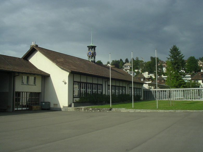 Angrenzend liegt am tiefsten Punkt des Geländes der grosse Hartplatz. Der multifunktionale Platz dient im Alltag als intensiv genutzter Pausen- und Ballspielbereich. Er steht im Verbund mit der alten Pausenhalle, die früher als Ersatz der fehlenden Turnhalle diente und heute wertvoll überdachte Flächen zur Verfügung stellen kann.
