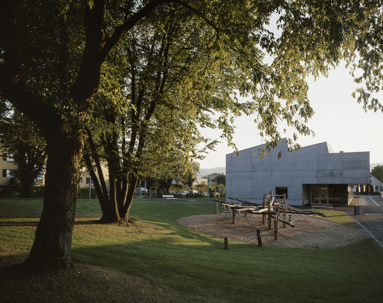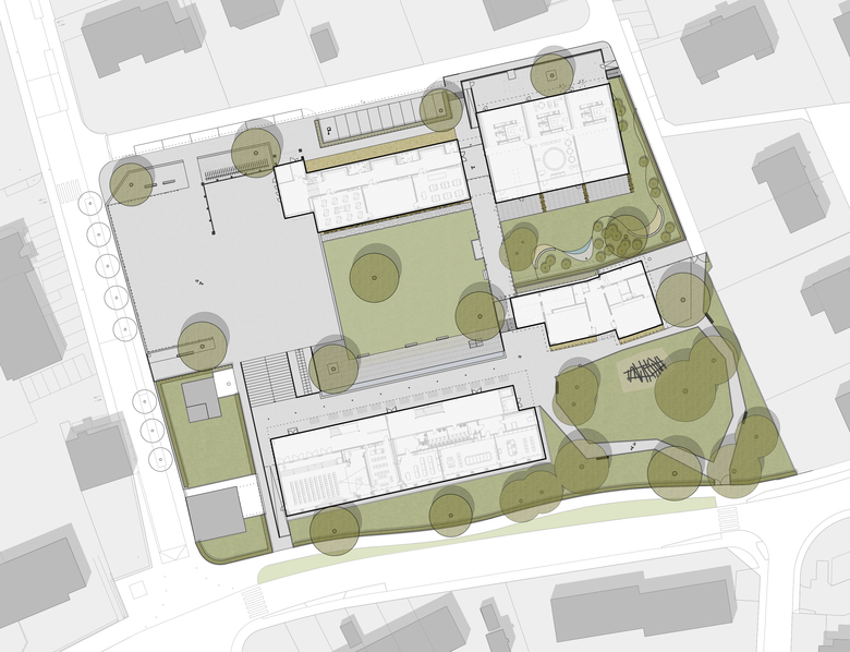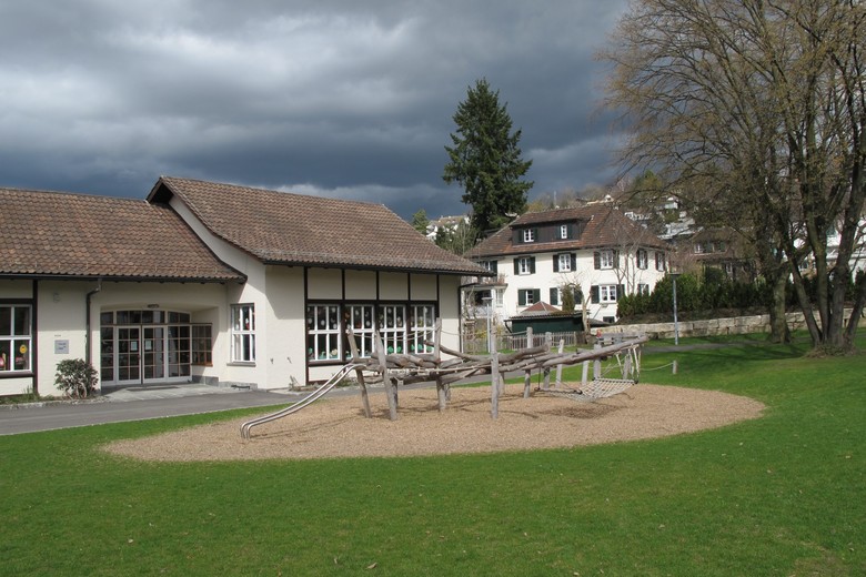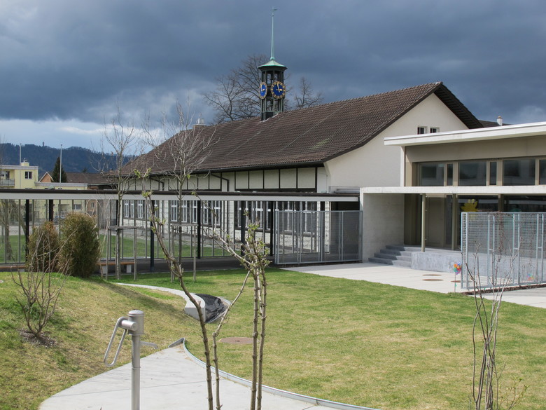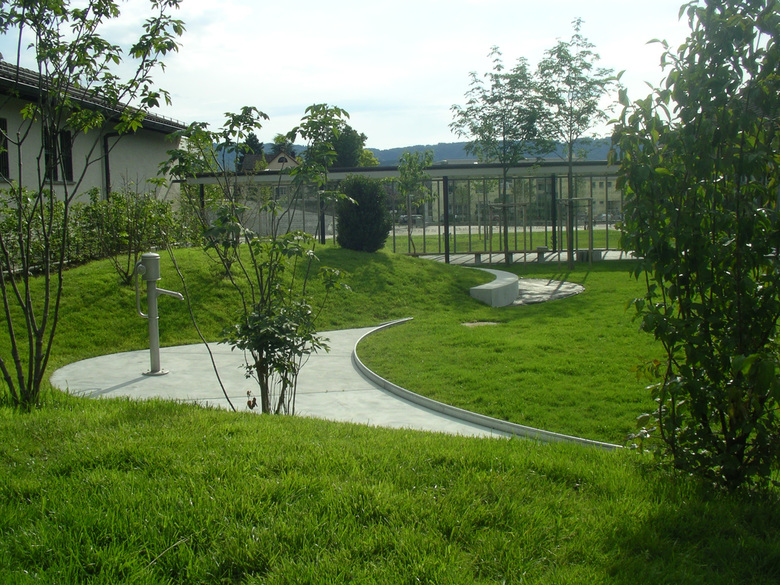 Die Aussenbereiche der neuen Grundstufe bieten abwechslungsreiche Bewegungs- und Spielflächen für die kleinen Kinder. Der Hof wird durch Grünflächen geprägt, die Höhendifferenz zum angrenzenden Gebäude als sanft modellierte Hügellandschaft ausgebildet. Darin eingebettet befinden sich Sand- und Wasserspielbereiche, zwischen Blütensträuchern entstehen Nischen und Schleichpfade. Als Kontrast dazu bietet der eingefasste Vorbereich an der Quartierstrasse Hartfläche für Roll-und Malspiele.