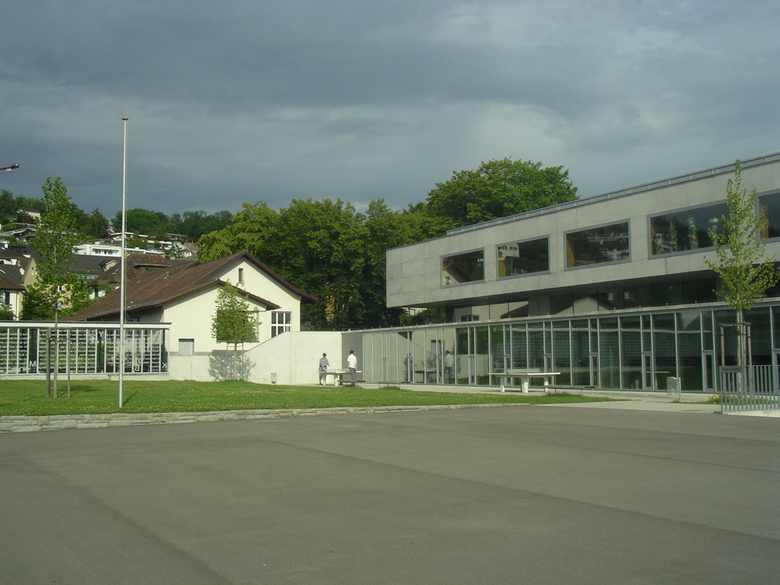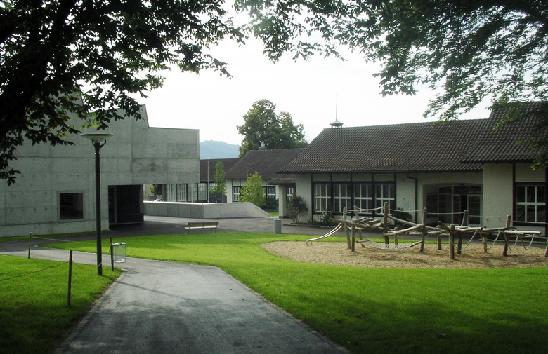 Eine Ebene tiefer spannt sich zwischen Neubau und dem alten Schulhaus ein zentraler Pausenhof auf. Um den ursprünglichen Gartencharakter aufzunehmen wurde ein Spezialkiesrasen entwickelt, der über das ganze Jahr hinweg witterungsunabhängig benutzt werden kann.