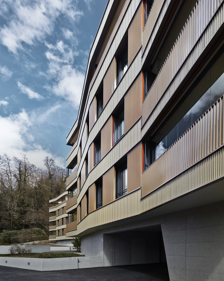 In Seenähe, an der Stadtgrenze von Luzern, wurde auf dem letzten freien Grundstück eine Wohnüberbauung erstellt. Sechs zueinander leicht verdrehte Punkthäuser definieren den Ort, sodass ein ausgewogenes Verhältnis zwischen Bebauung und Freifläche entsteht. Die lockere Anordnung der Häuser bewirkt eine Leichtigkeit, erzeugt fliessende Aussenräume und etabliert ein vielfältiges Netz an Sicht- und Raumbeziehungen innerhalb der Überbauung und zum See. Horizontale Bänder aus Keramikplatten und Segmente farbig hinterlegter Bronzestäbe zwischen den Öffnungen verleihen den Fassaden eine irisierende Wirkung. Diese wird durch die Verdrehung der Häuser verstärkt und lässt die Gebäude je nach Sichtwinkel und Lichteinfall einmal monochrom, einmal in dezentem Farbenspiel erscheinen. Die drei bis vier Wohnungen pro Geschoss sind übereck angeordnet, sodass jede von einer zwei- bis dreiseitigen Ausrichtung profitiert. Ergänzt werden die attraktiven, gut besonnten Wohnbereiche durch grosszügige Loggien.