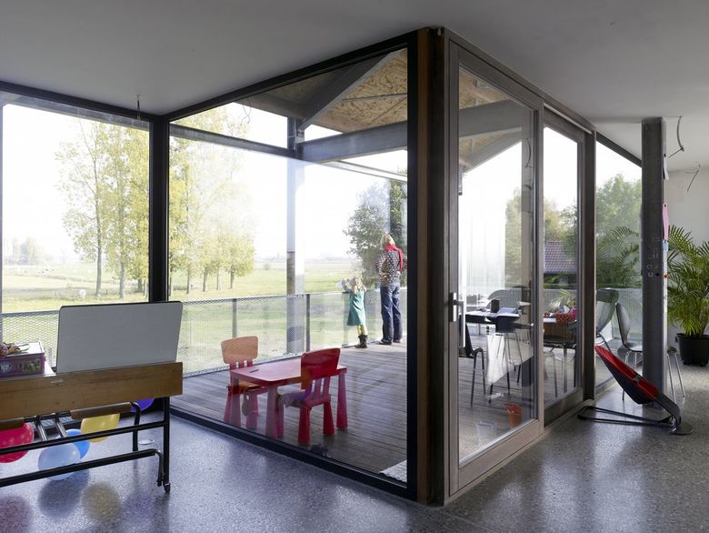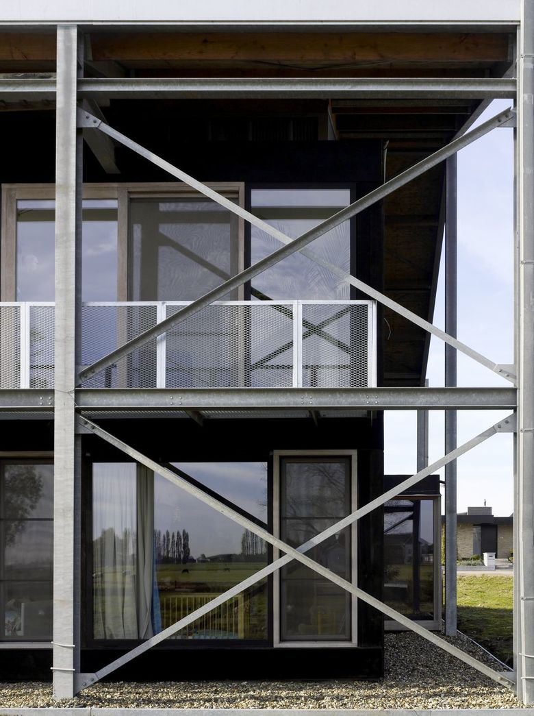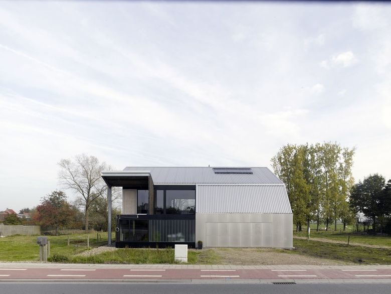 De tweede ontwerpzet introduceert de welgekende Vlaamse staltypologie: een industriële “ready-made” stalen structuur wordt in een mum van tijd opgetrokken. Onder deze herkenbare typologie stapelt de bouwheer zijn eigen woonvolumes. Dat rekt het bouwproces enigszins maar het engagement van deze zelfbouwende familie is intenser en intrigerender dan een “normaal” bouwproces.