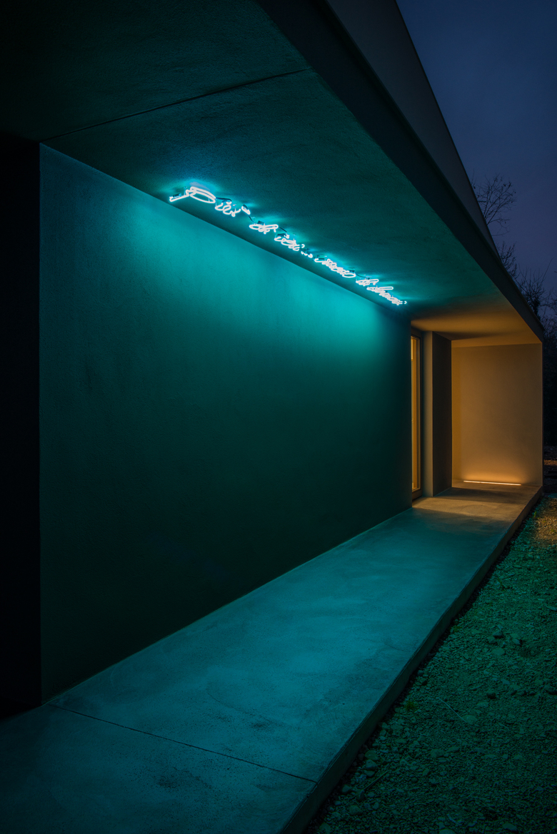 Una casa rifugio, nave, capanna, scrigno di vetro e legno. Un’anima di X-Lam vestita di un liscio abito candido. La spirale della scala è una scultura, il femminino che irrompe e riconnette la semplice griglia del sistema. La copertura è un lenzuolo bianco steso lungo un filo invisibile, due ali a riposo, la piega a valle di un origami immaginario.