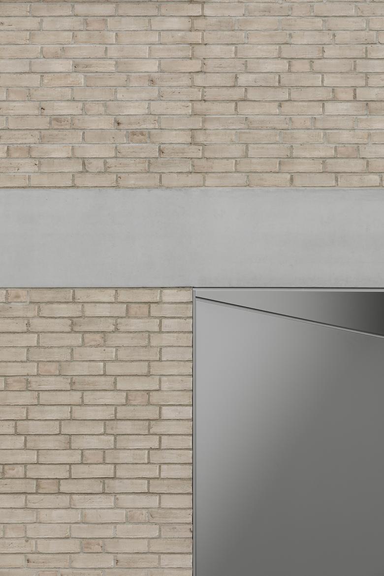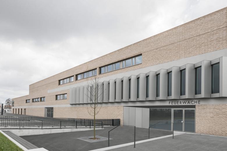 Die unterschiedlichen Gebäudeteile und der Schlauchturm werden durch eine einheitliche Materialität zu einer Gesamtanlage zusammengefasst. Einen spannungsreichen Kontrast bilden die großflächigen geschlossenen Wandflächen zu den Verglasungen der Fenster- und Torflächen.