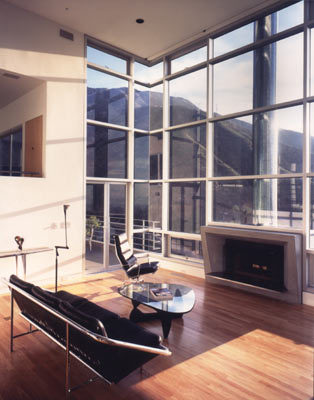 The building fronts the street with a fragmented wall of concrete block and a rigid, rectilinear composition of stucco forms and glass block that evoke the presence of a barrier that obscures, while hinting at what exists beyond. In contrast, the rear, hillside elevation consists of a softer, perforated, curvilinear plane bisected by a glazed, transparent object anchored to the hill on a broad base of concrete block. The resultant experience consists of a building that hides the site on approach, and then reveals its many vistas as as the building is entered and unfolds.