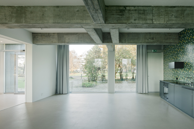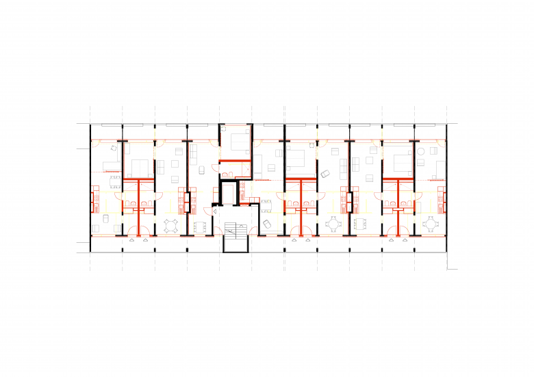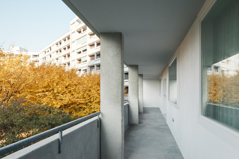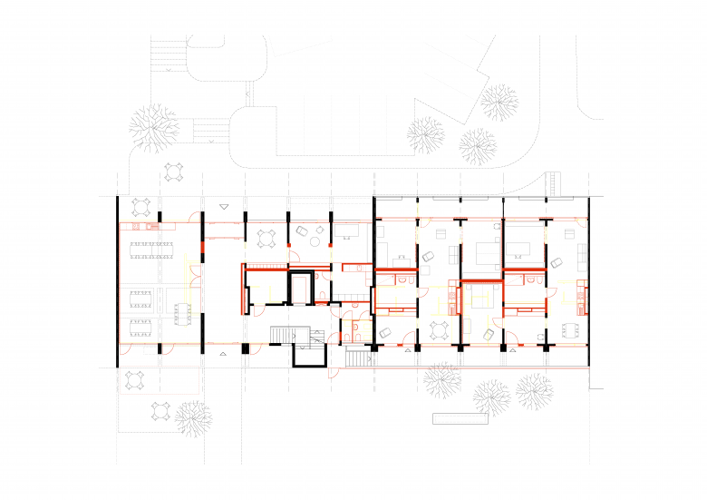 Gesamtsanierung der Alterssiedlung aus den siebziger Jahren mit Wohnungzusammenlegungen. Neue Gemeinschaftsbereiche.