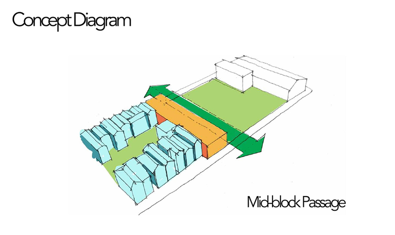 The southern portion of the building is designed with an industrial aesthetic intended to reflect the industrial precedents in the Dogpatch Historic District, especially the adjacent building at 970 Tennessee Street, which was constructed in 1935. Set back from this historic industrial building by the proposed mid-block passage, the new building will span the width of the parcel along the mid-block passage. The northern portion of the building, in contrast, will have an architectural aesthetic intended to reflect the more residential character of the Dogpatch Historic District, especially the Pelton Cottages and other residential buildings found further south along Tennessee Street and Minnesota Street, with their repetitive verticality and narrow gaps between them.